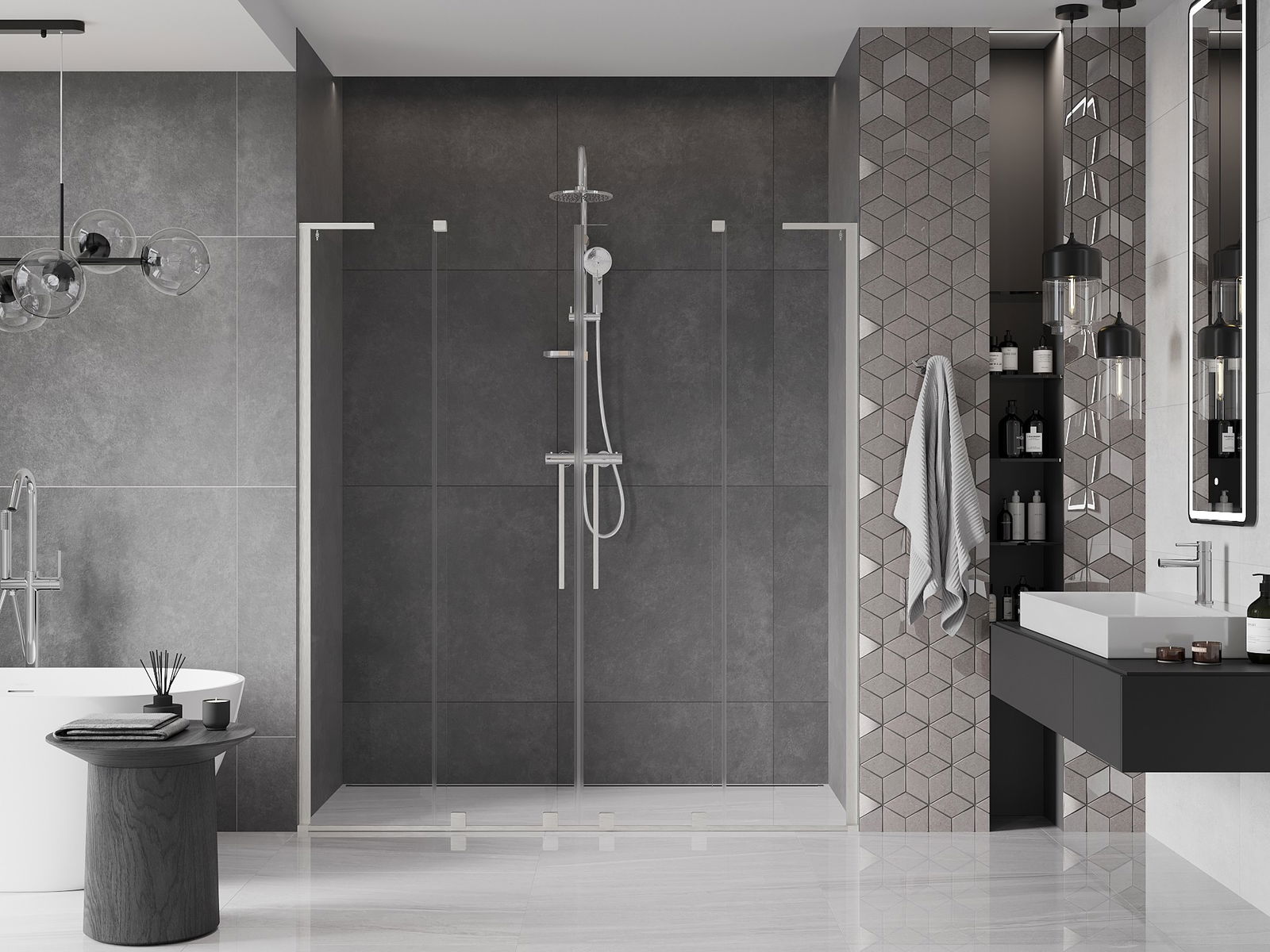 Pega prática e confortável feita de aço inoxidável. A forma moderna, combinada com o acabamento adaptado à cor dos perfis, dá ao conjunto uma aparência moderna e estilosa, realçando a estética de qualquer casa de banho.