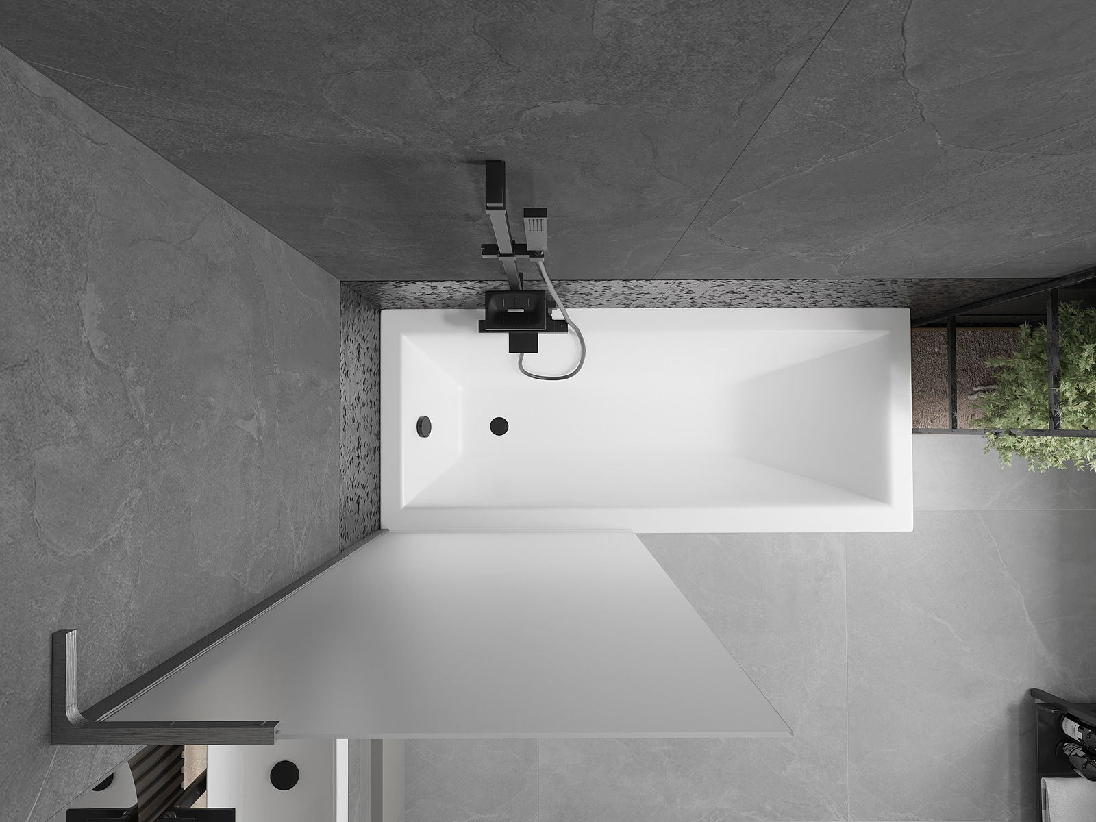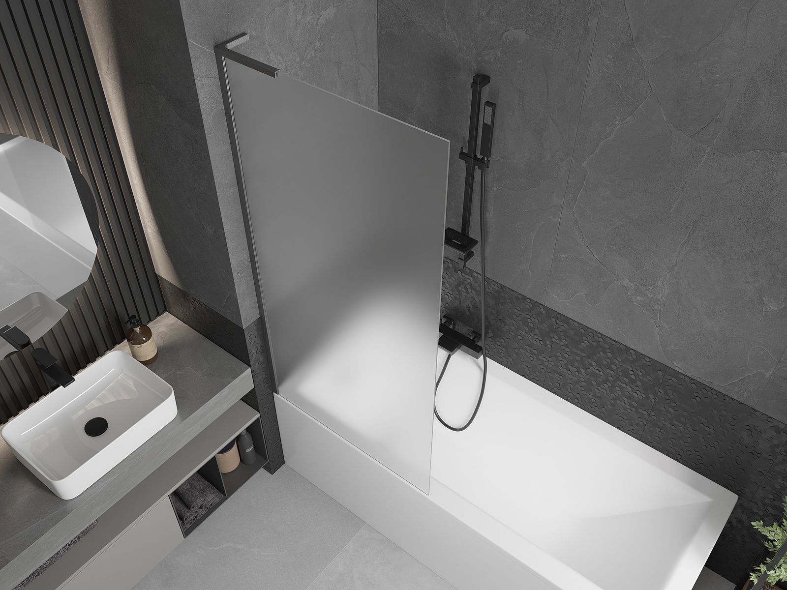 Proteção eficaz contra o derramamento de água durante o banho. O parapeito possui vedações que se ajustam perfeitamente à superfície do vidro e à borda da banheira. Solução funcional que garante segurança e fácil manutenção da limpeza.