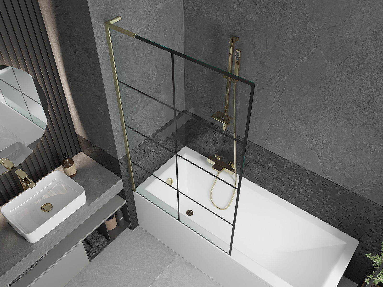 Mexen Next L painel de banheira de 1 folha 100 x 150 cm, rede preta, ouro escovado - 895-100-000-03-77-55