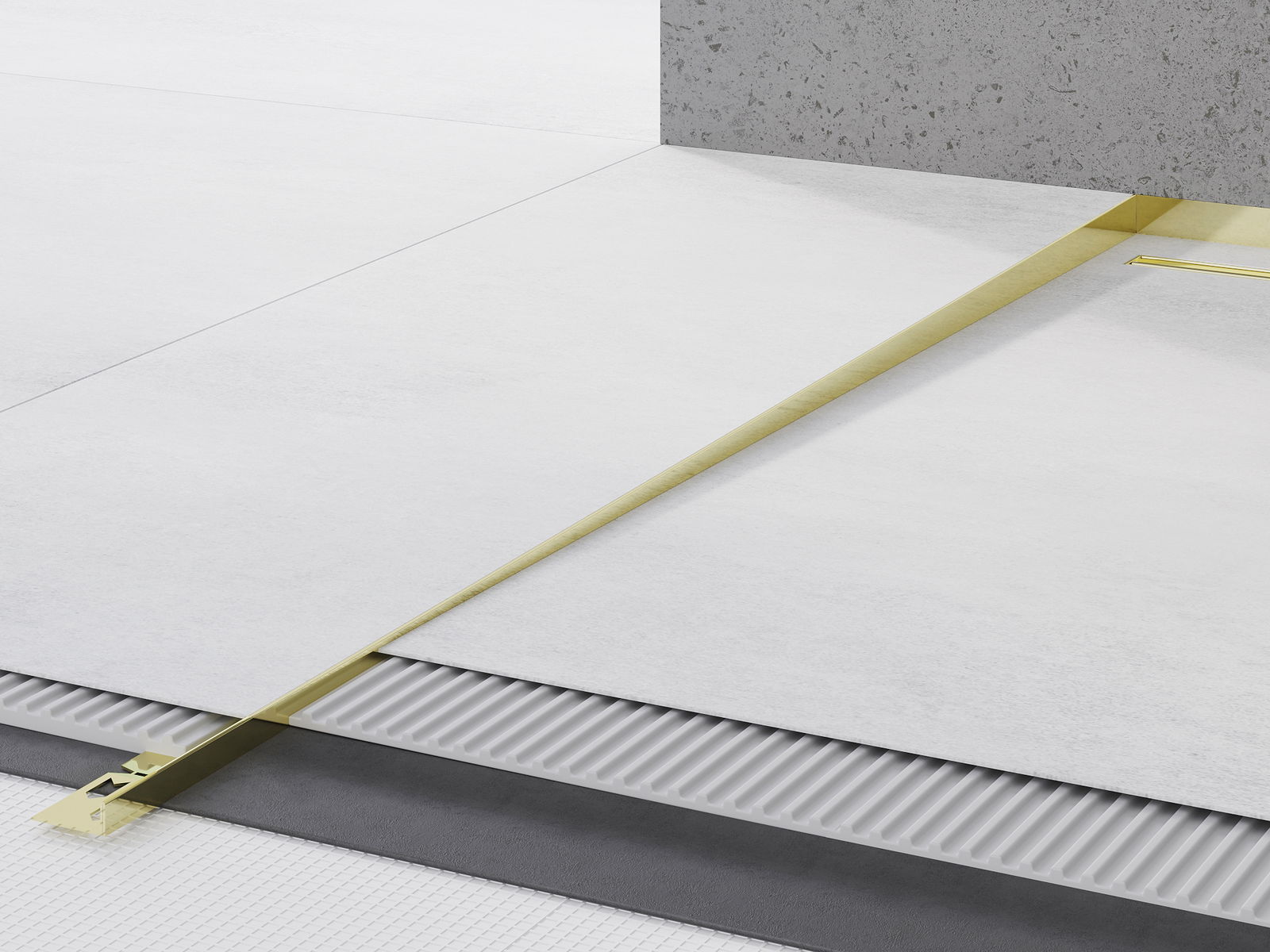 A borda lateral da barra cria uma inclinação unilateral para o ralo linear sem necessidade de fazer o chamado envelope