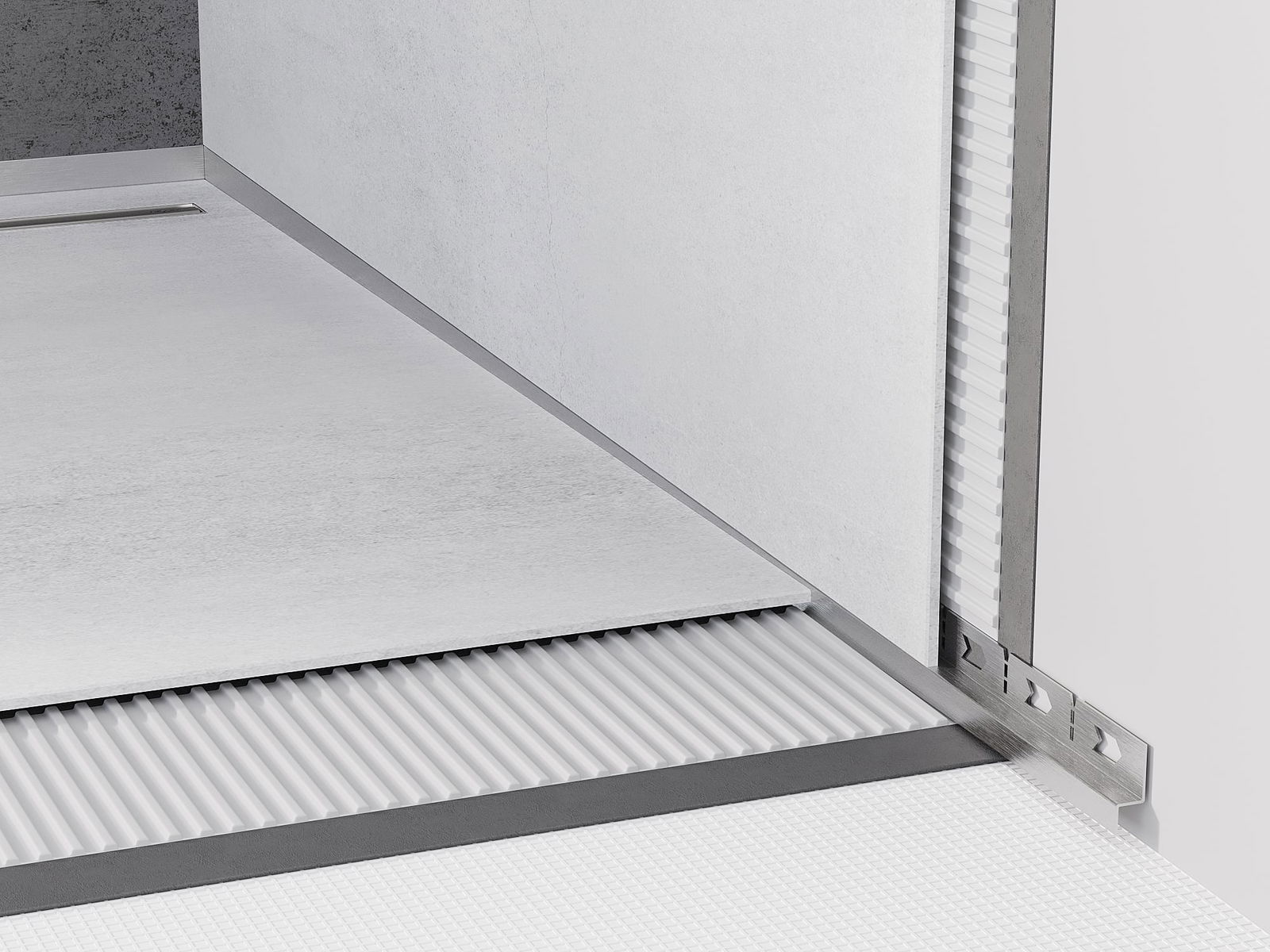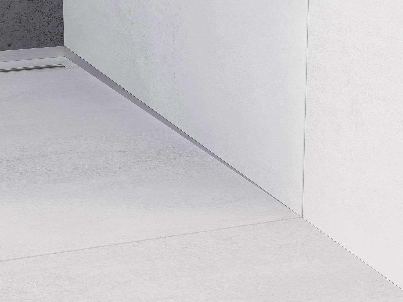 A borda lateral do trilho força um declive unilateral para o dreno linear sem a necessidade de fazer o chamado envelope