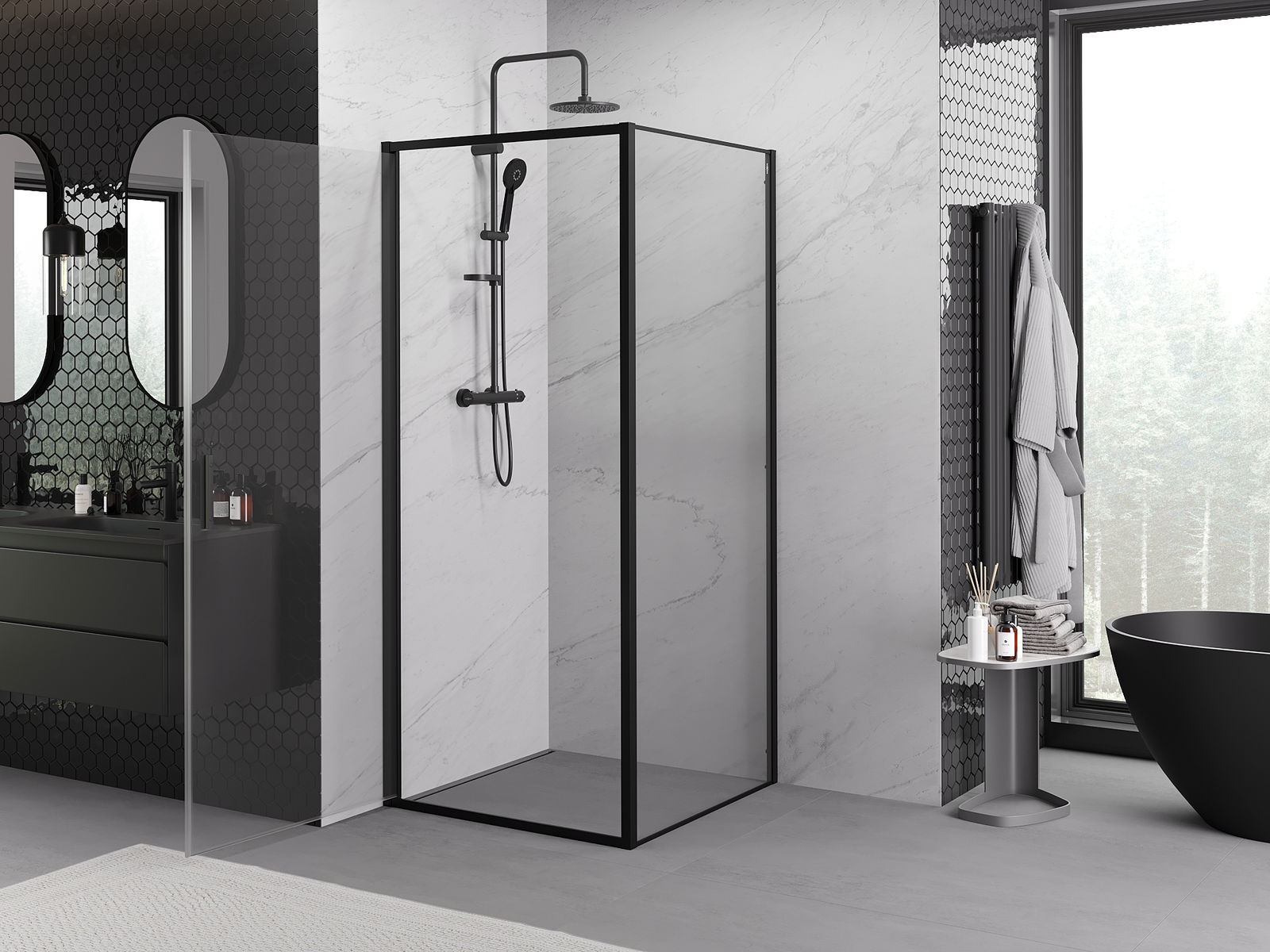 A pega prática e confortável foi feita de metal durável e resistente. A forma moderna combinada com o acabamento ajustado à cor dos perfis confere a todo o conjunto uma aparência moderna e estilosa, realçando a estética de qualquer casa de banho.
