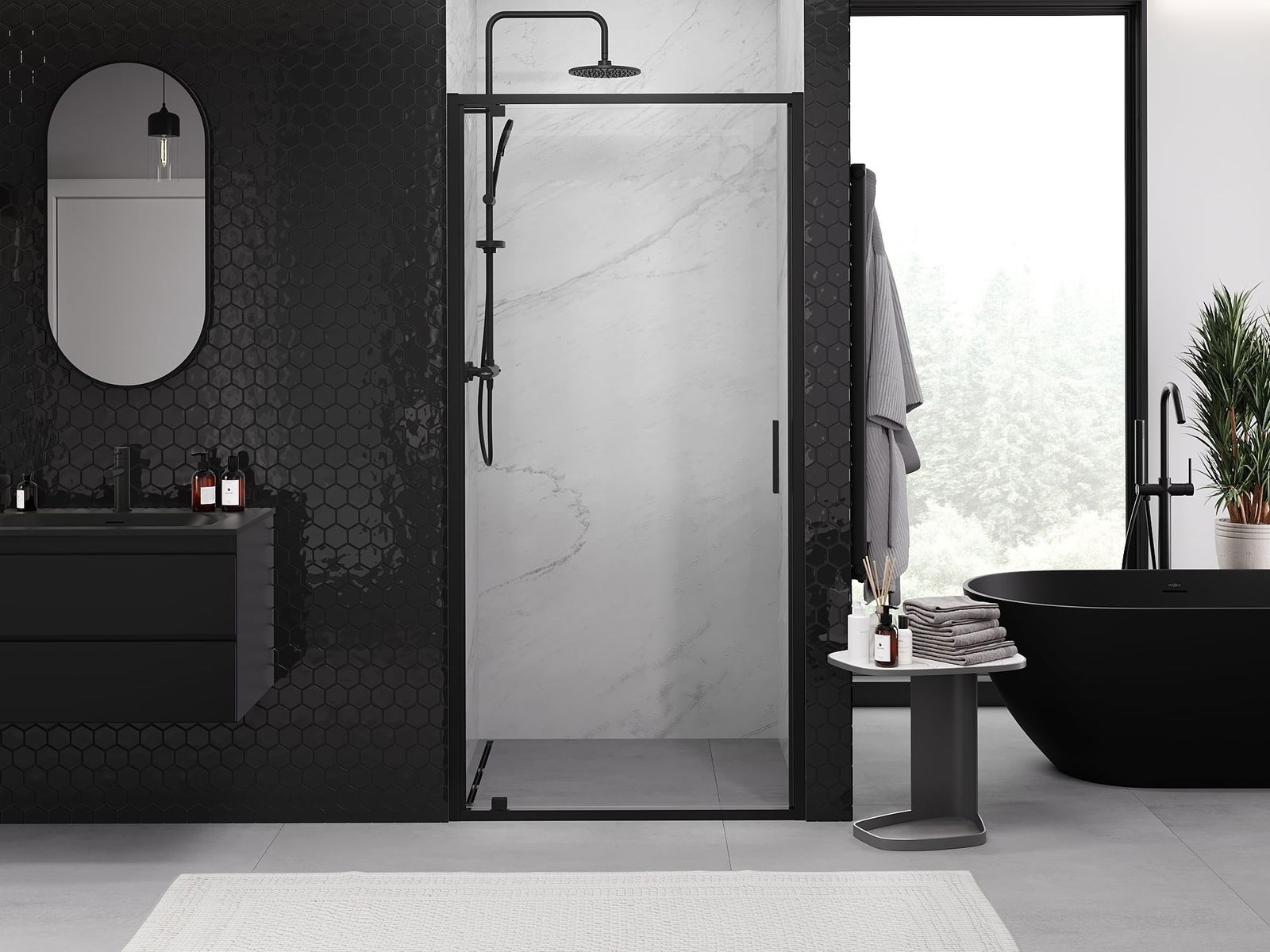 A pega prática e confortável foi feita de metal durável e resistente. A forma moderna combinada com o acabamento ajustado à cor dos perfis confere a todo o conjunto uma aparência moderna e estilosa, realçando a estética de qualquer casa de banho.