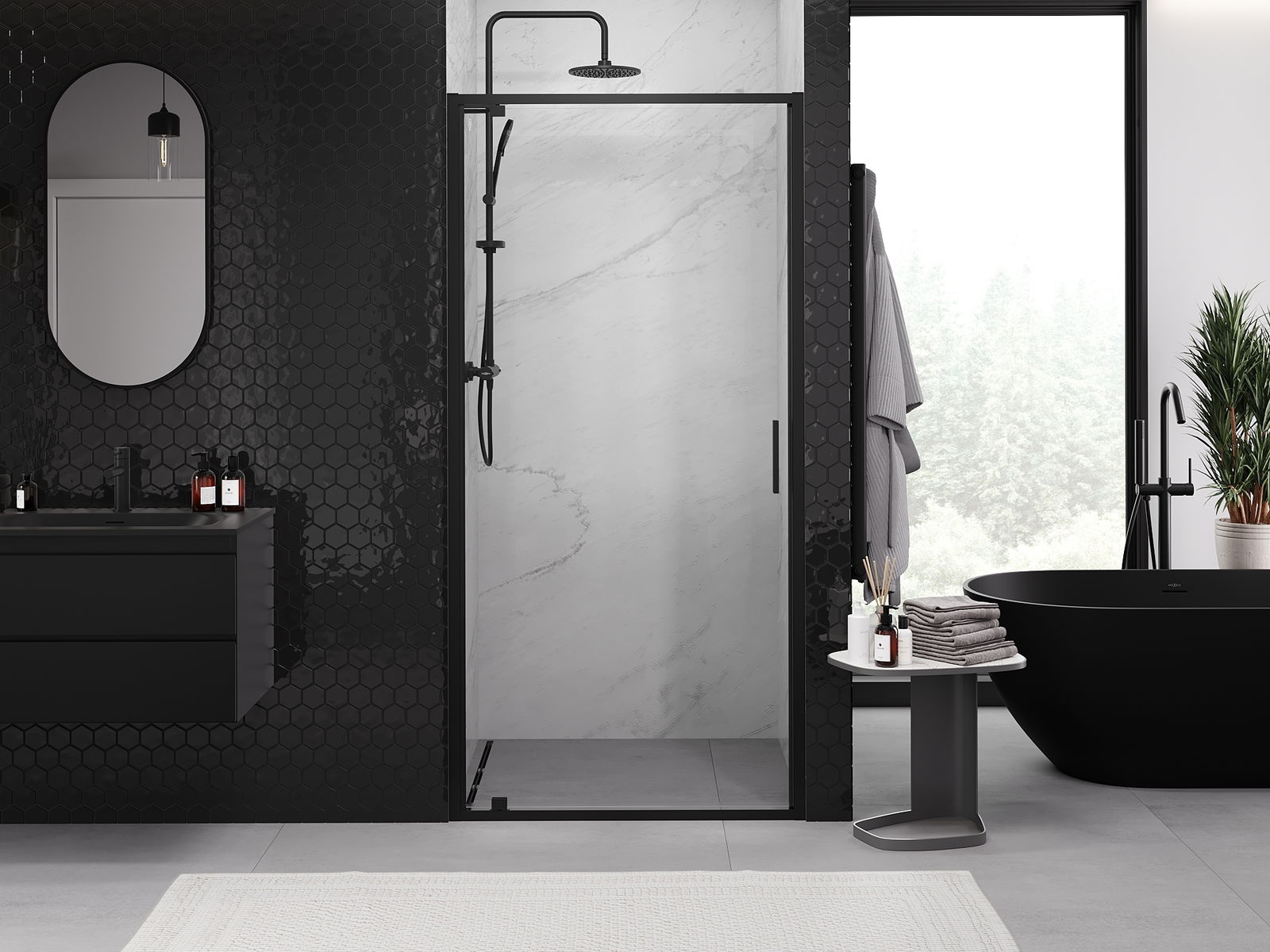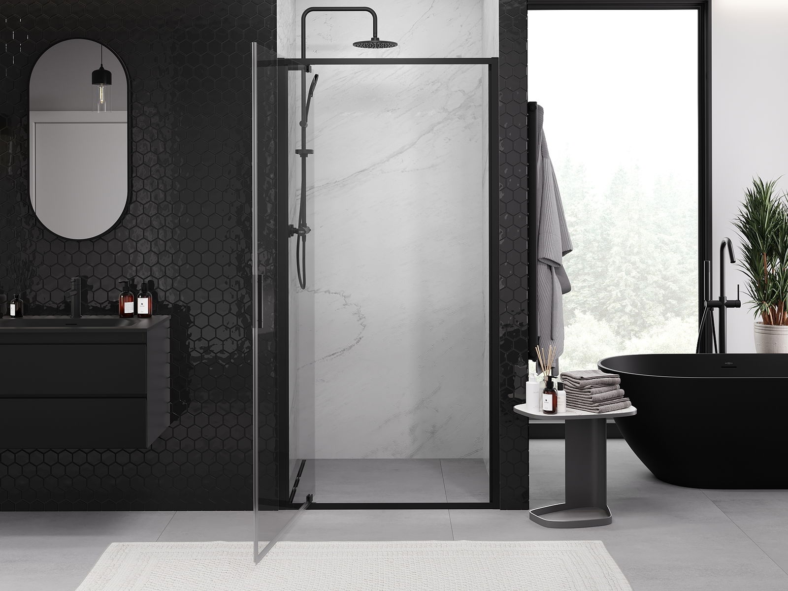 A pega prática e confortável foi feita de metal durável e resistente. A forma moderna combinada com o acabamento ajustado à cor dos perfis confere a todo o conjunto uma aparência moderna e estilosa, realçando a estética de qualquer casa de banho.