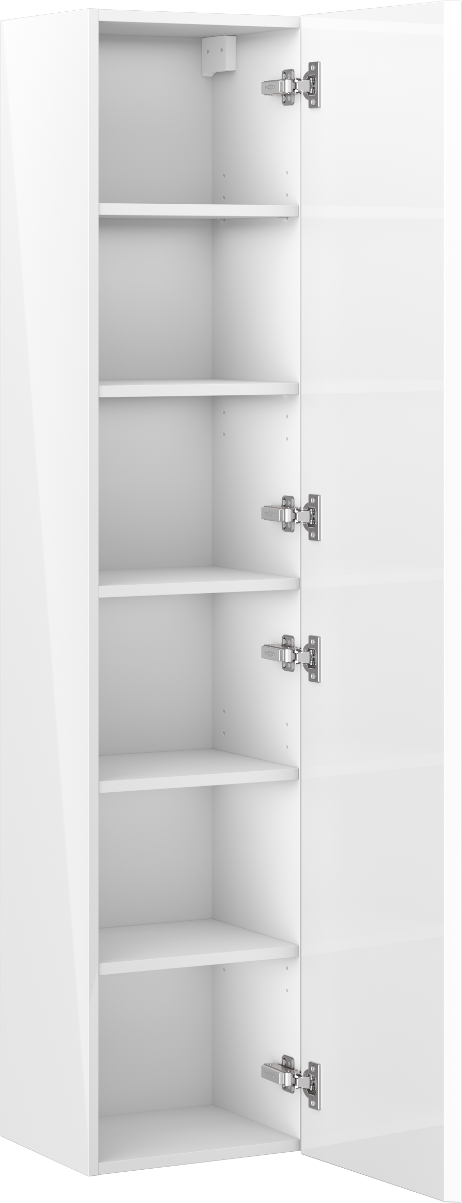 Possibilidade de regular a altura das prateleiras. Esta é uma solução funcional que permite ajustar o interior do armário às necessidades em mudança do utilizador. É particularmente útil na casa de banho, onde se armazenam objetos de várias alturas, como cosméticos, produtos de limpeza, toalhas ou acessórios de casa de banho.
