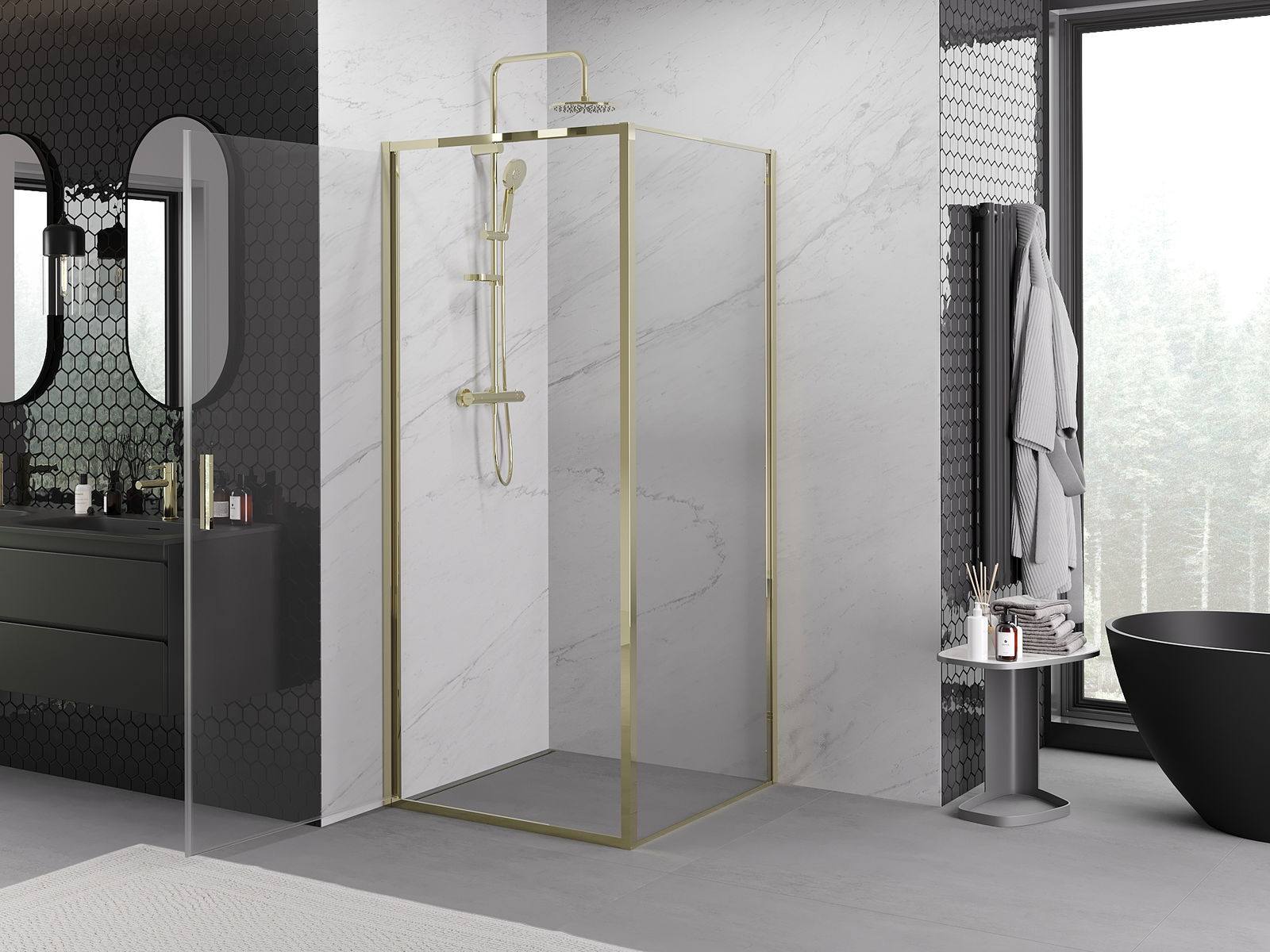 A pega prática e confortável foi feita de metal durável e resistente. A forma moderna combinada com o acabamento ajustado à cor dos perfis confere a todo o conjunto uma aparência moderna e estilosa, realçando a estética de qualquer casa de banho.