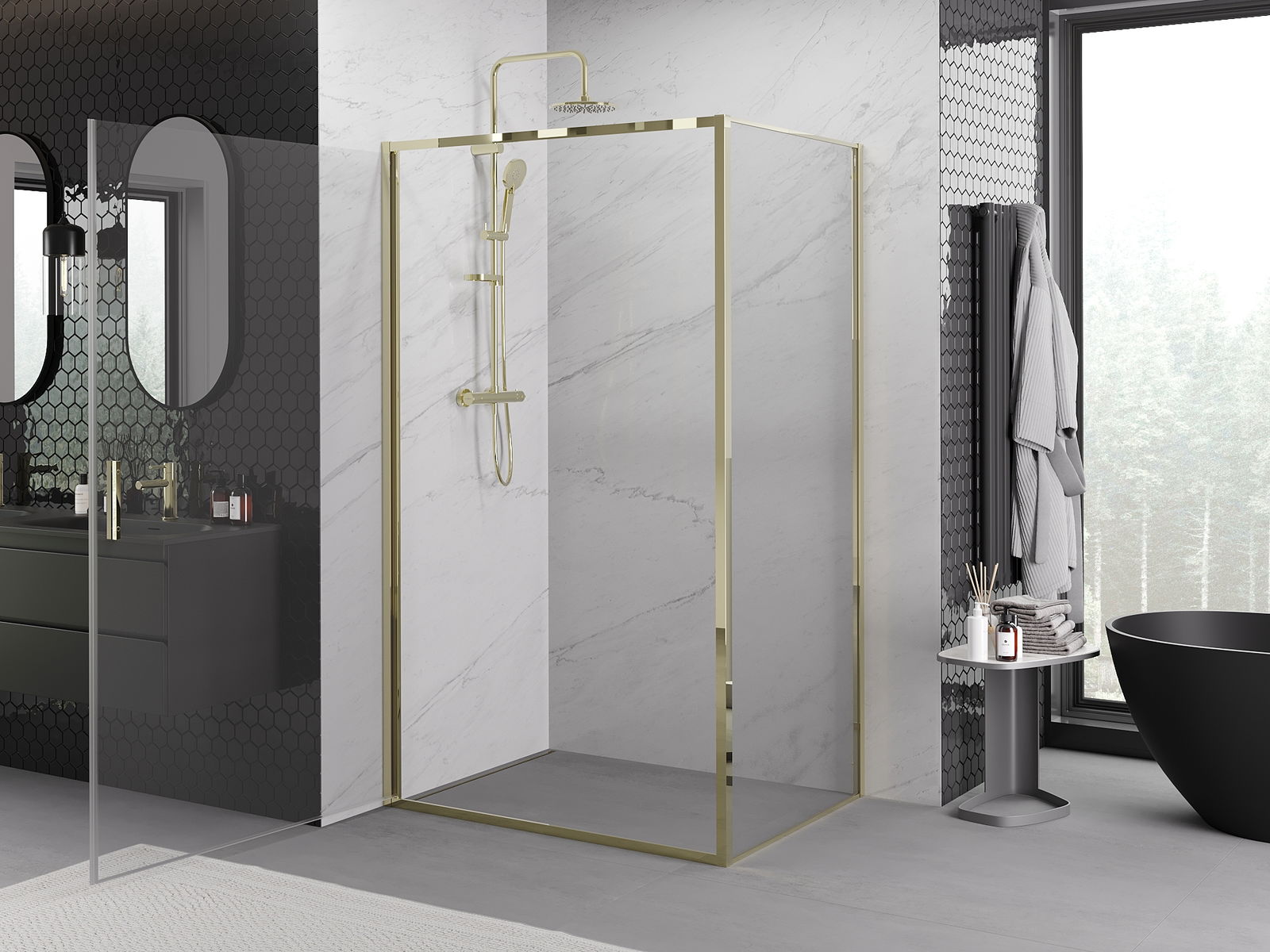 A pega prática e confortável foi feita de metal durável e resistente. A forma moderna combinada com o acabamento ajustado à cor dos perfis confere a todo o conjunto uma aparência moderna e estilosa, realçando a estética de qualquer casa de banho.
