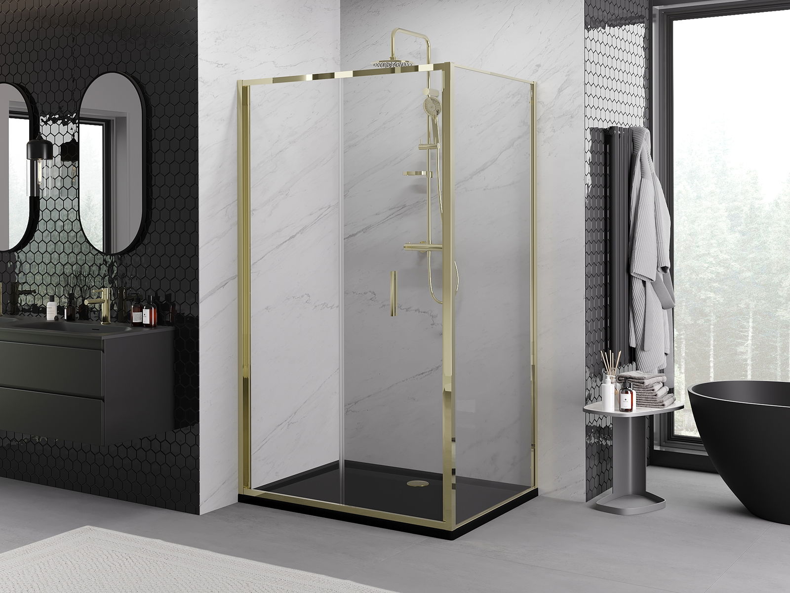 A pega prática e confortável foi feita de metal durável e resistente. A forma moderna combinada com o acabamento ajustado à cor dos perfis confere a todo o conjunto uma aparência moderna e estilosa, realçando a estética de qualquer casa de banho.