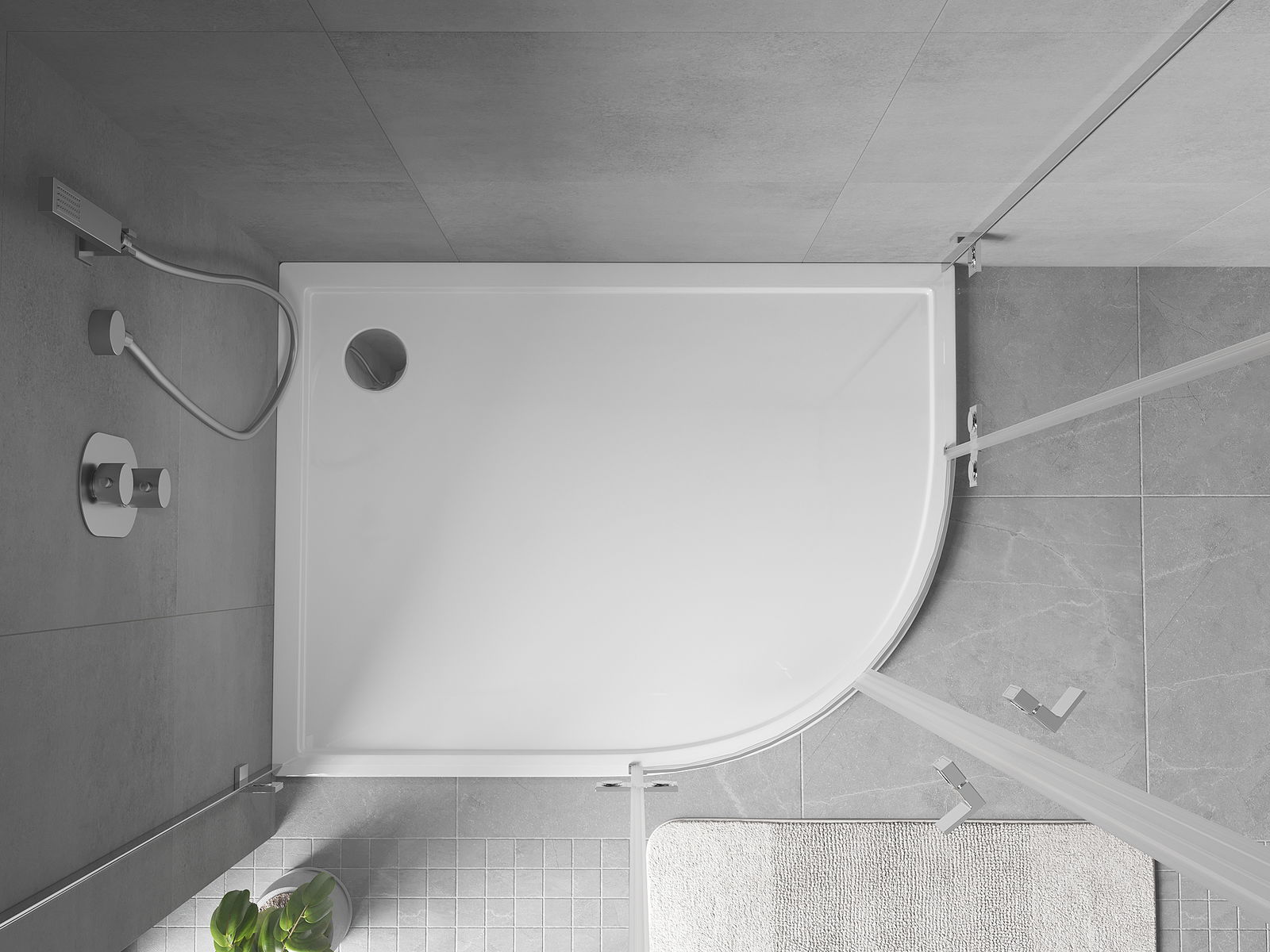 A base de duche foi concebida de forma a permitir que a água escoe livremente na direção do ralo. Assegura uma drenagem rápida e eficiente da água da superfície da base de duche, prevenindo a formação de poças e o alagamento da casa de banho.