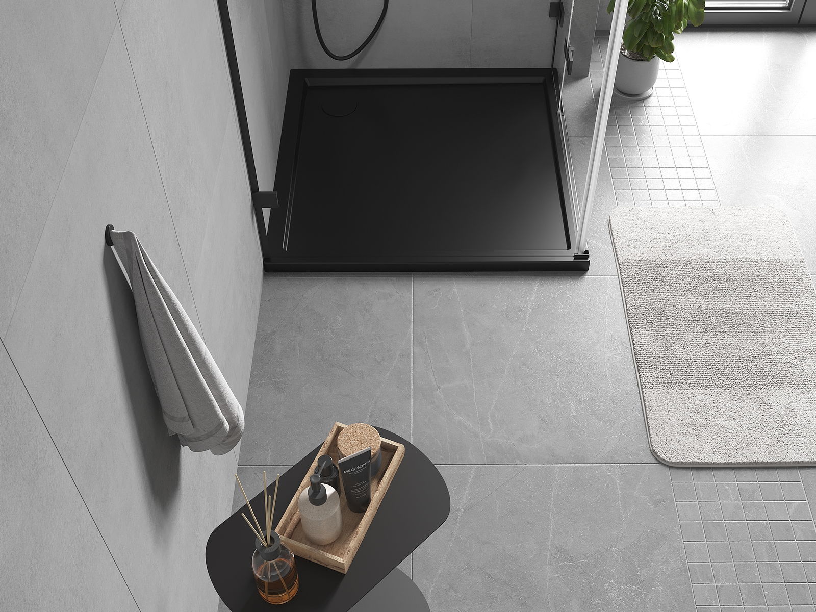 A base de duche foi concebida de forma a permitir que a água escoe livremente na direção do ralo. Assegura uma drenagem rápida e eficiente da água da superfície da base de duche, prevenindo a formação de poças e o alagamento da casa de banho.
