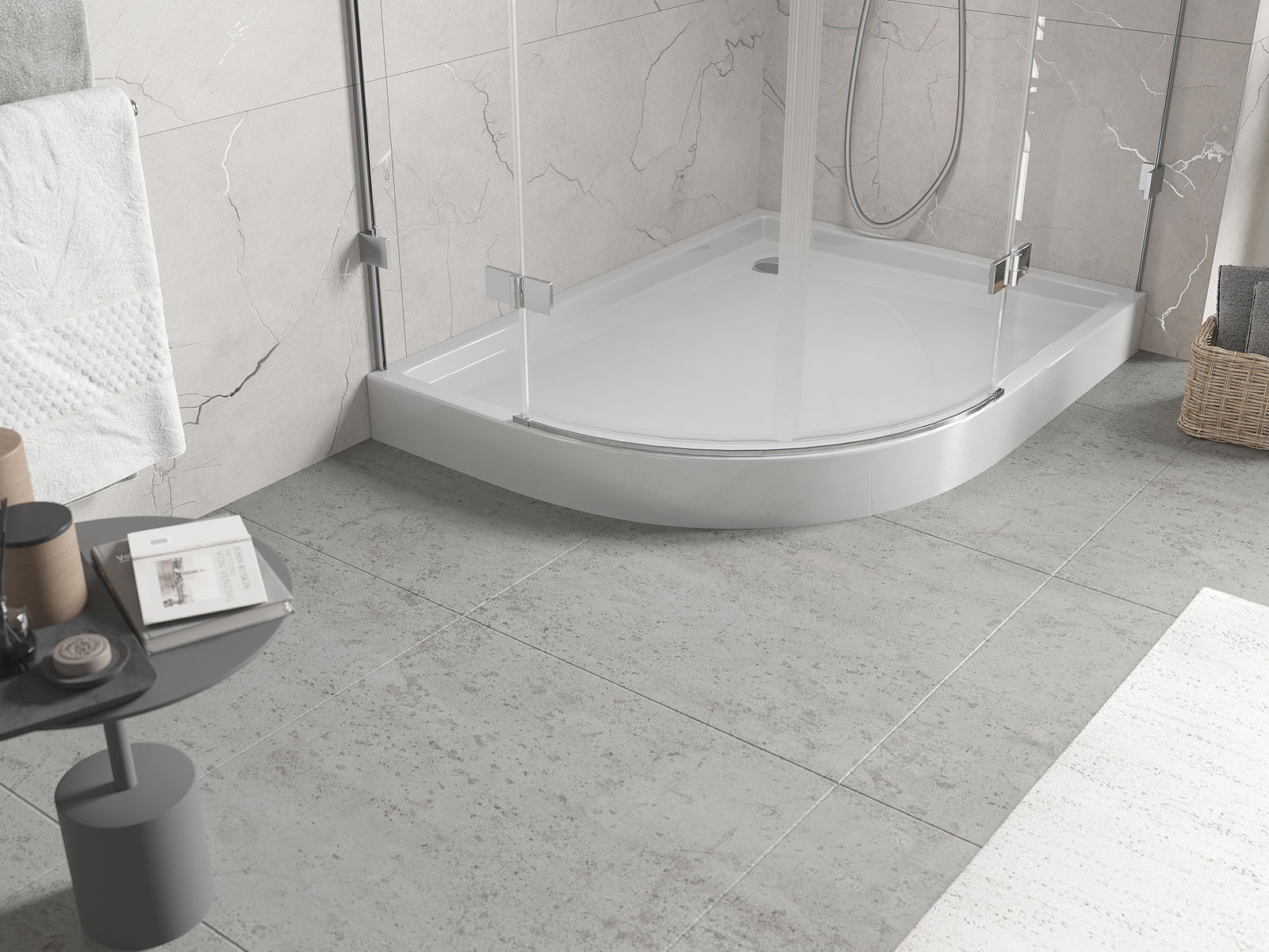 A base de duche foi concebida de forma a permitir que a água escoe livremente na direção do ralo. Assegura uma drenagem rápida e eficiente da água da superfície da base de duche, prevenindo a formação de poças e o alagamento da casa de banho.