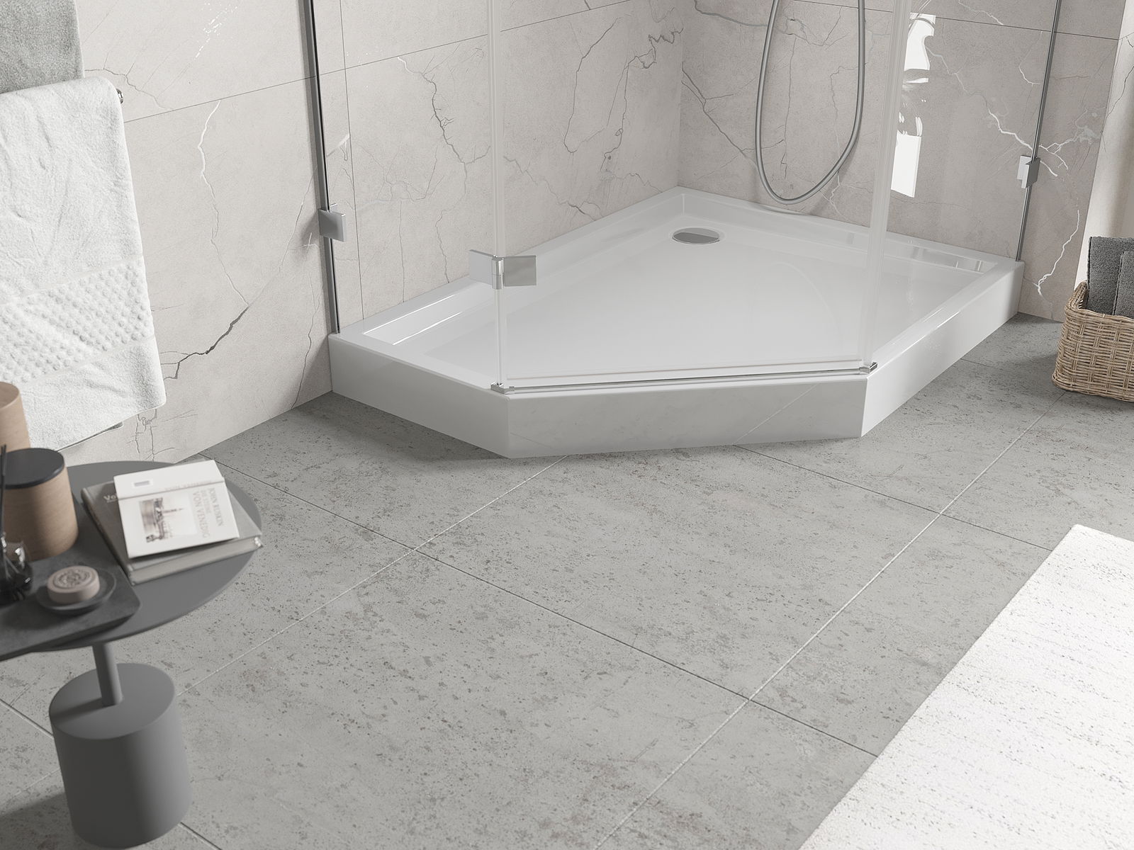 A base de duche foi concebida de forma a permitir que a água escoe livremente na direção do ralo. Assegura uma drenagem rápida e eficiente da água da superfície da base de duche, prevenindo a formação de poças e o alagamento da casa de banho.