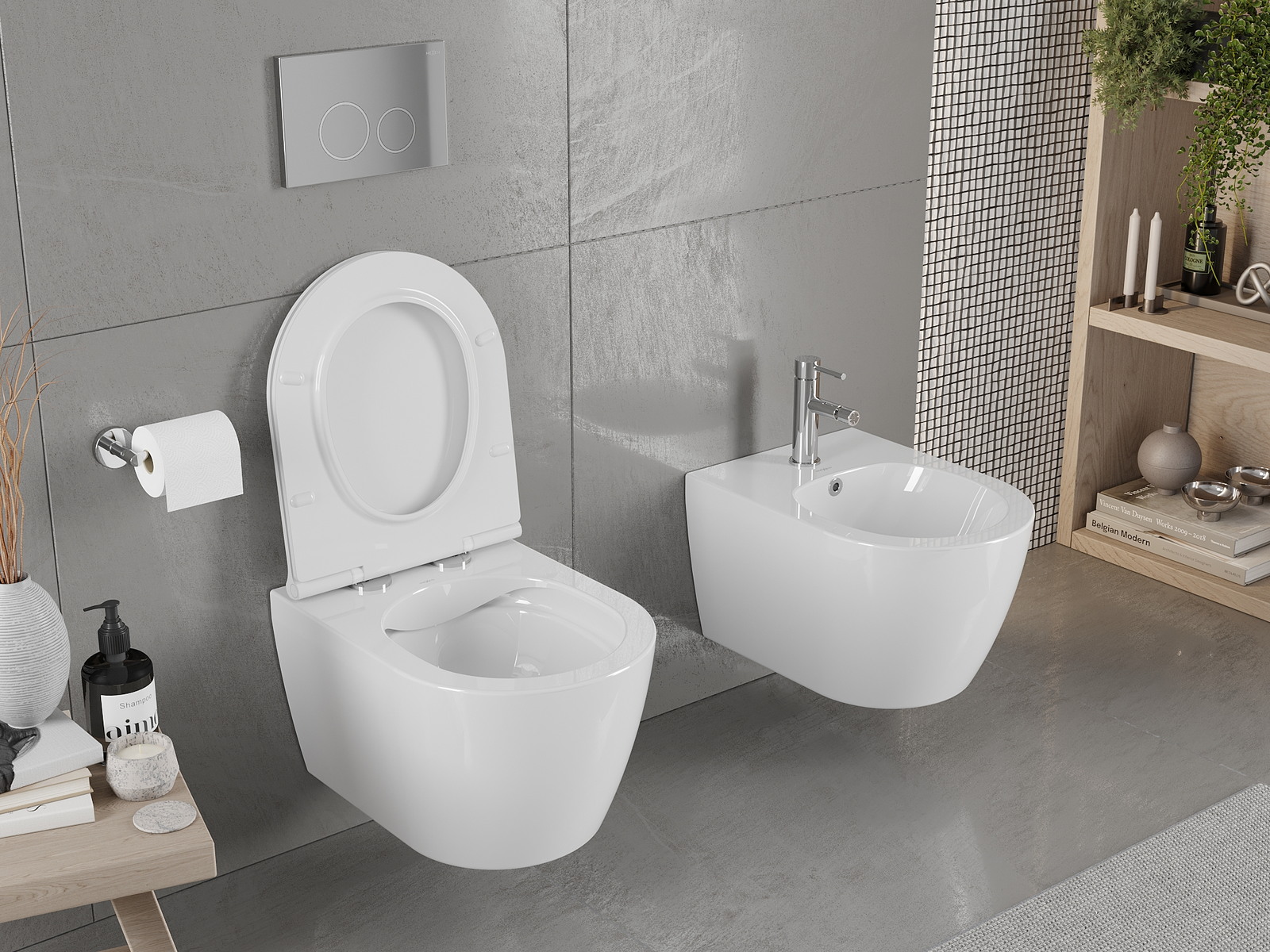 Sistema moderno, no qual todos os elementos de montagem foram ocultados. Não é apenas uma solução estética, mas também muito prática. Facilita a manutenção da casa de banho limpa e assegura um aspeto arrumado.