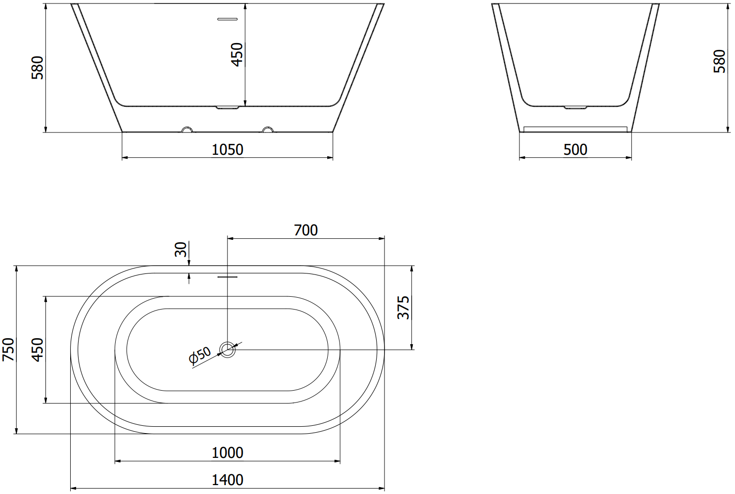 Mexen Luna banheira independente 140 x 75 cm, branca/preta, transbordamento cromado - 52031407575-01