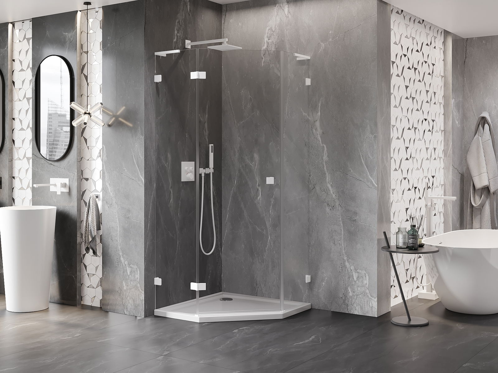 A pega prática e confortável foi feita de metal durável e resistente. A forma moderna combinada com o acabamento ajustado à cor dos perfis confere a todo o conjunto uma aparência moderna e estilosa, realçando a estética de qualquer casa de banho.