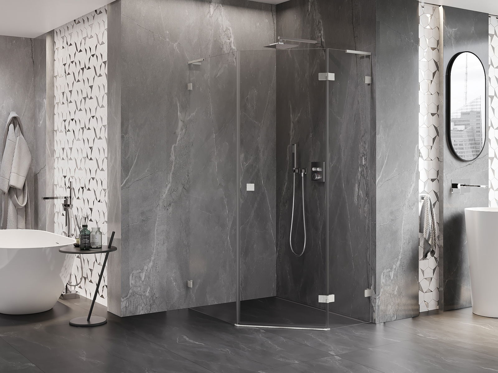 A pega prática e confortável foi feita de metal durável e resistente. A forma moderna combinada com o acabamento ajustado à cor dos perfis confere a todo o conjunto uma aparência moderna e estilosa, realçando a estética de qualquer casa de banho.