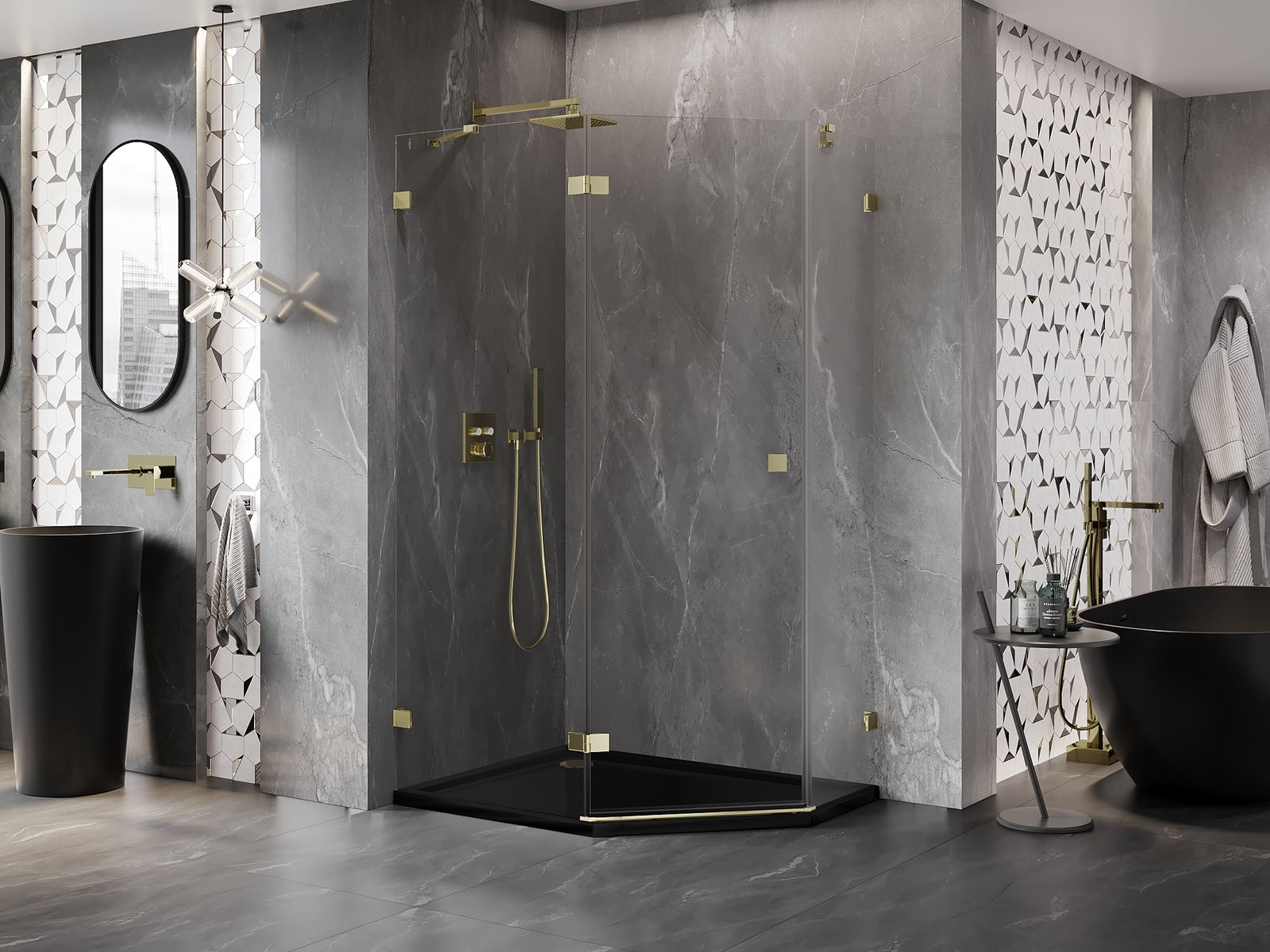 Mexen Lunar cabine de duche pentagonal pivotante esquerda 90 x 80 cm, transparente, dourada - 831-090L-080P-50-00-L