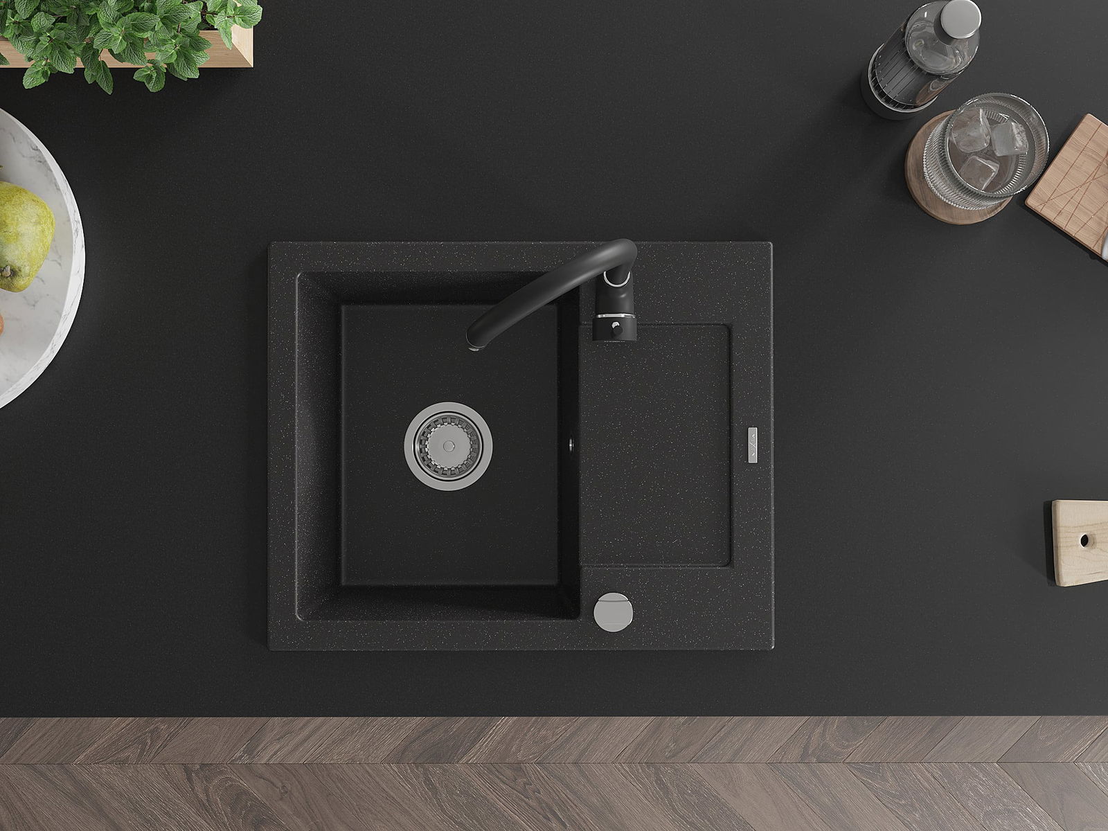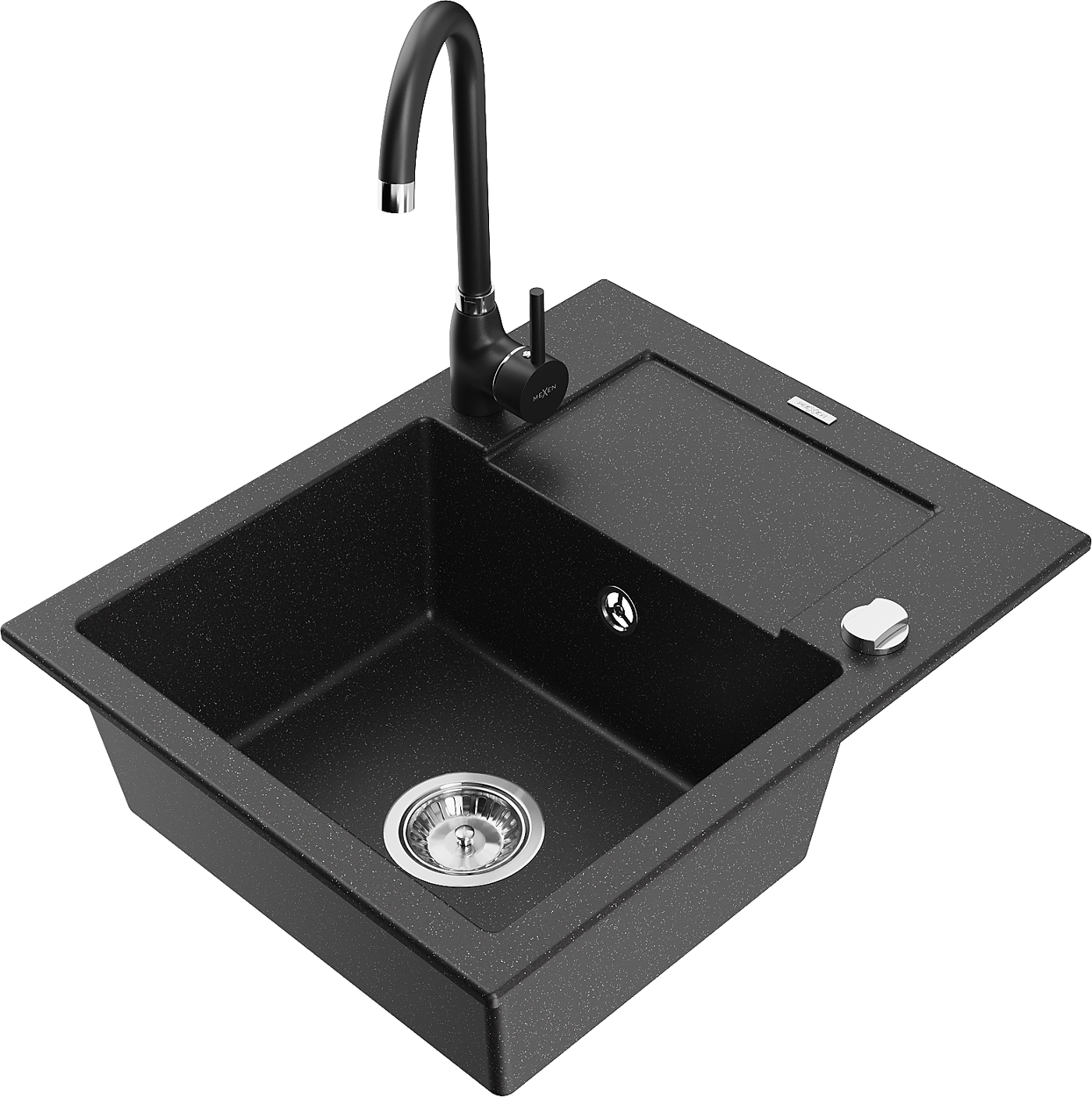 Mexen Enzo lava-loiça em granito, 1 bacia com escorredor e torneira de cozinha Telma, preto/prata - 6506-73-670200-70