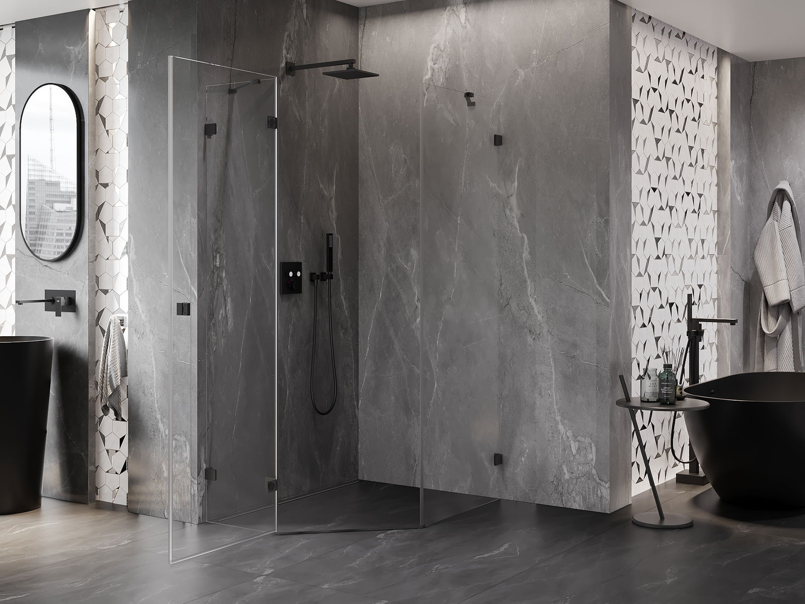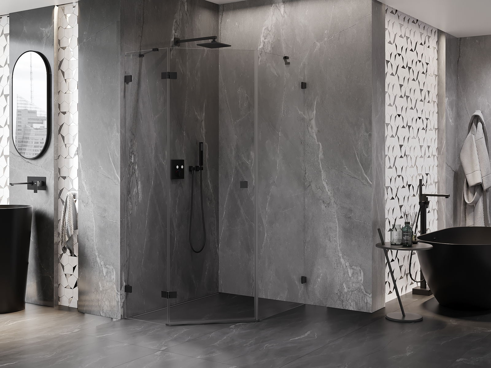 A pega prática e confortável foi feita de metal durável e resistente. A forma moderna combinada com o acabamento ajustado à cor dos perfis confere a todo o conjunto uma aparência moderna e estilosa, realçando a estética de qualquer casa de banho.