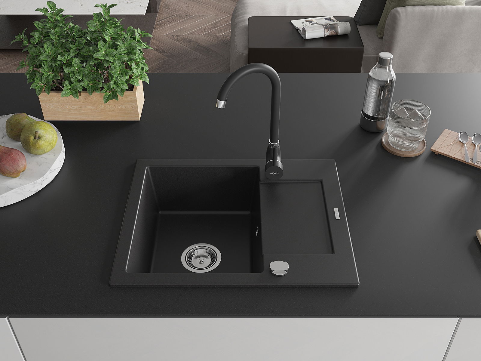 Mexen Enzo lava-loiça de granito 1-cuba com escorredor e torneira de cozinha Telma, preto - 6506-77-670200-70