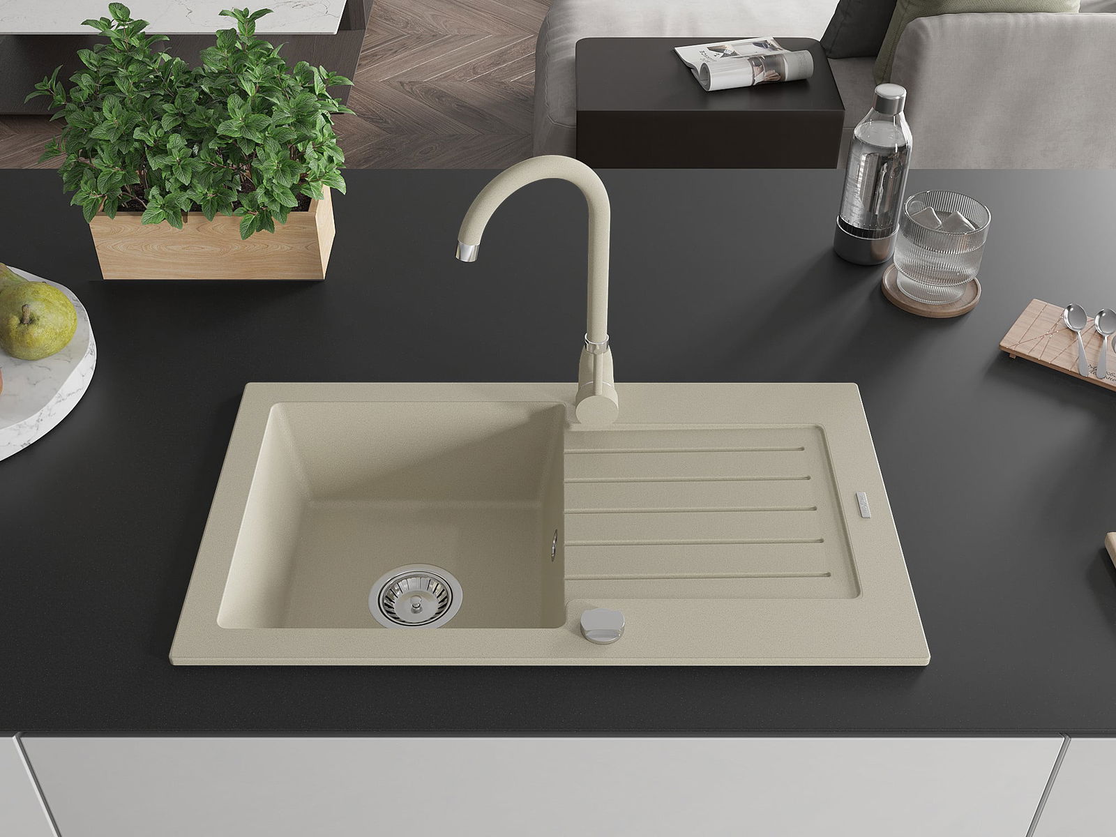 O lava-loiça é feito de granito de alta qualidade. Constitui um complemento elegante, e acima de tudo prático, para qualquer cozinha, independentemente do seu estilo. A alta qualidade e durabilidade do granito garantem muitos anos de utilização.