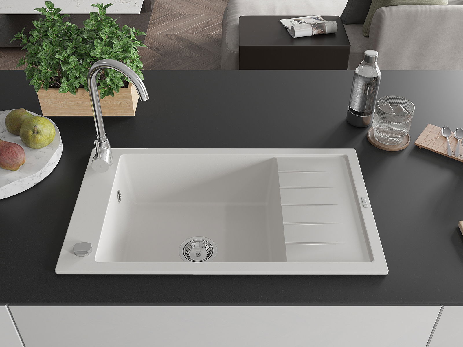 O lava-loiça é feito de granito de alta qualidade. Constitui um complemento elegante, e acima de tudo prático, para qualquer cozinha, independentemente do seu estilo. A alta qualidade e durabilidade do granito garantem muitos anos de utilização.