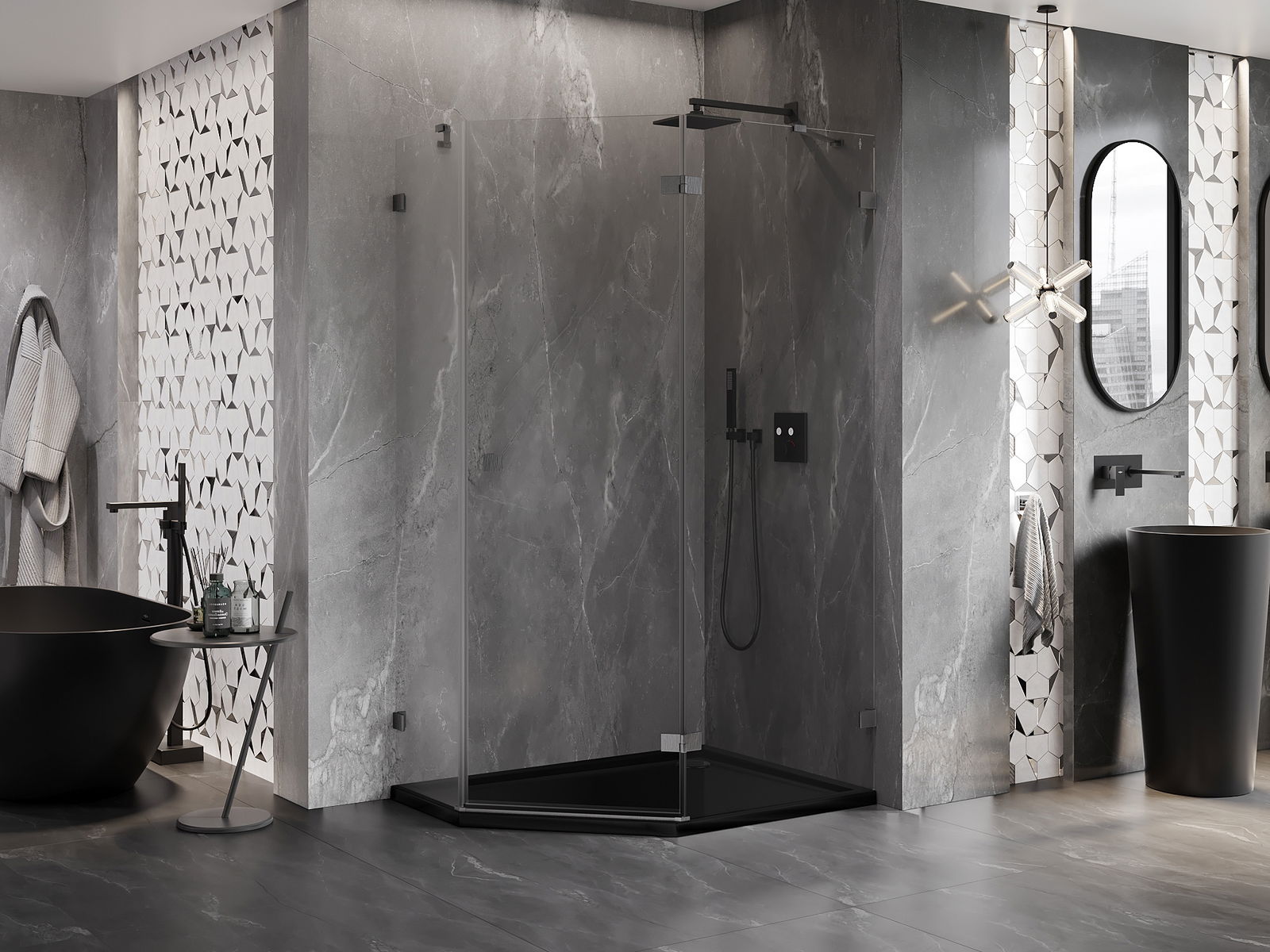 Mexen Lunar cabine de duche pentagonal de batente direita 90 x 80 cm, transparente, cinza metalizado escovado