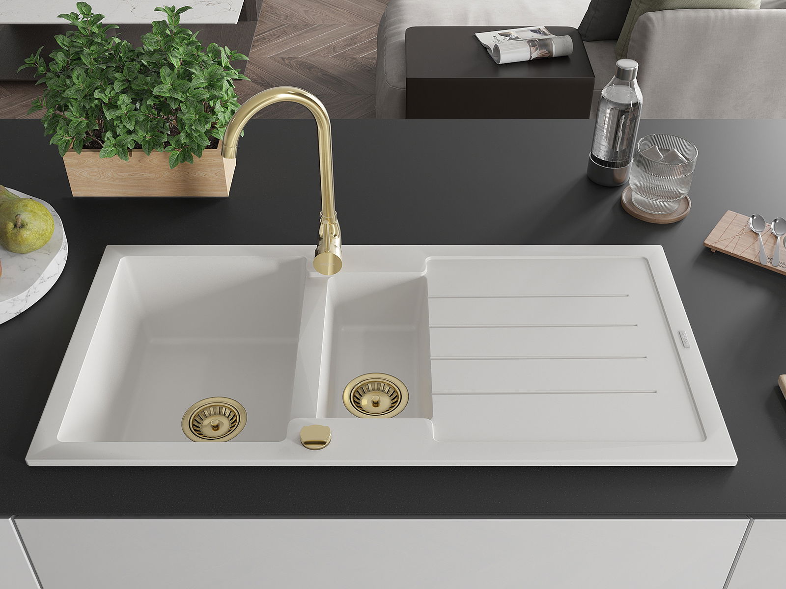 Mexen Andres lava-loiça de granito com 1,5 câmara com escorredor e torneira de cozinha Telma, branco - 6515-20-670200-50