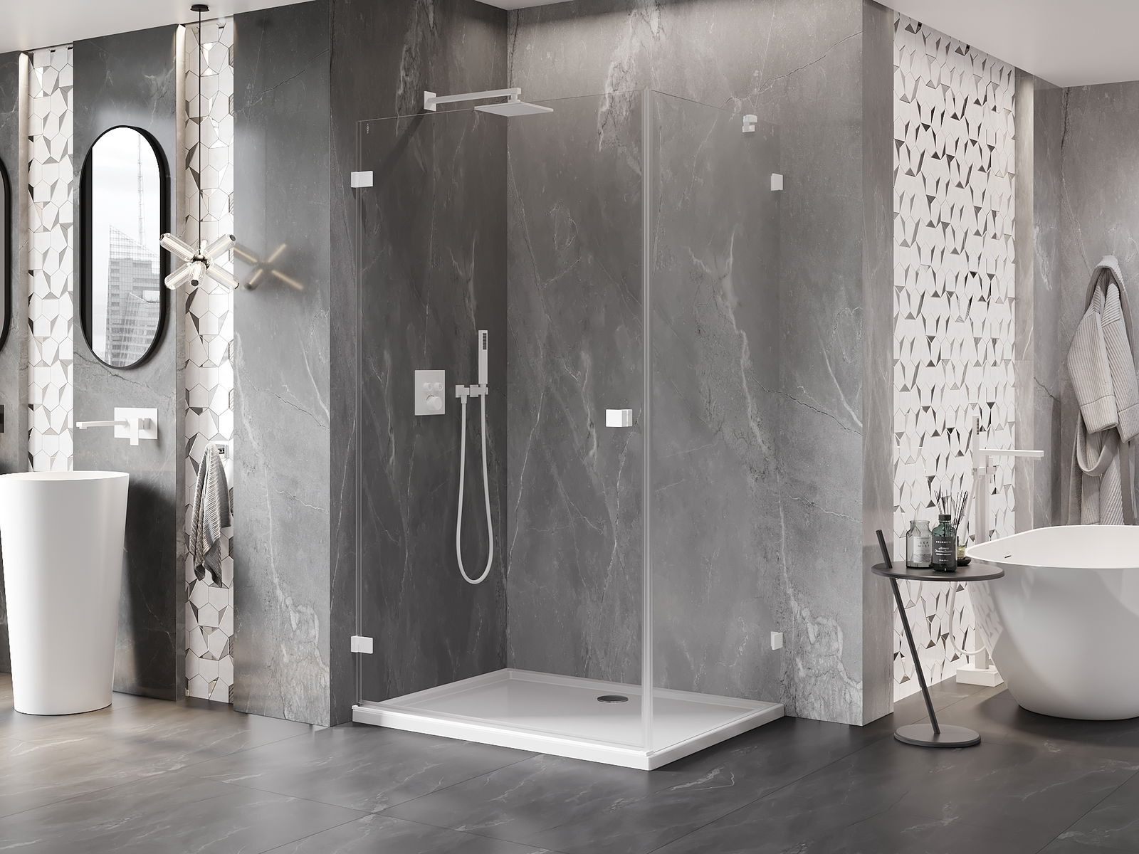 A pega prática e confortável foi feita de metal durável e resistente. A forma moderna combinada com o acabamento ajustado à cor dos perfis confere a todo o conjunto uma aparência moderna e estilosa, realçando a estética de qualquer casa de banho.
