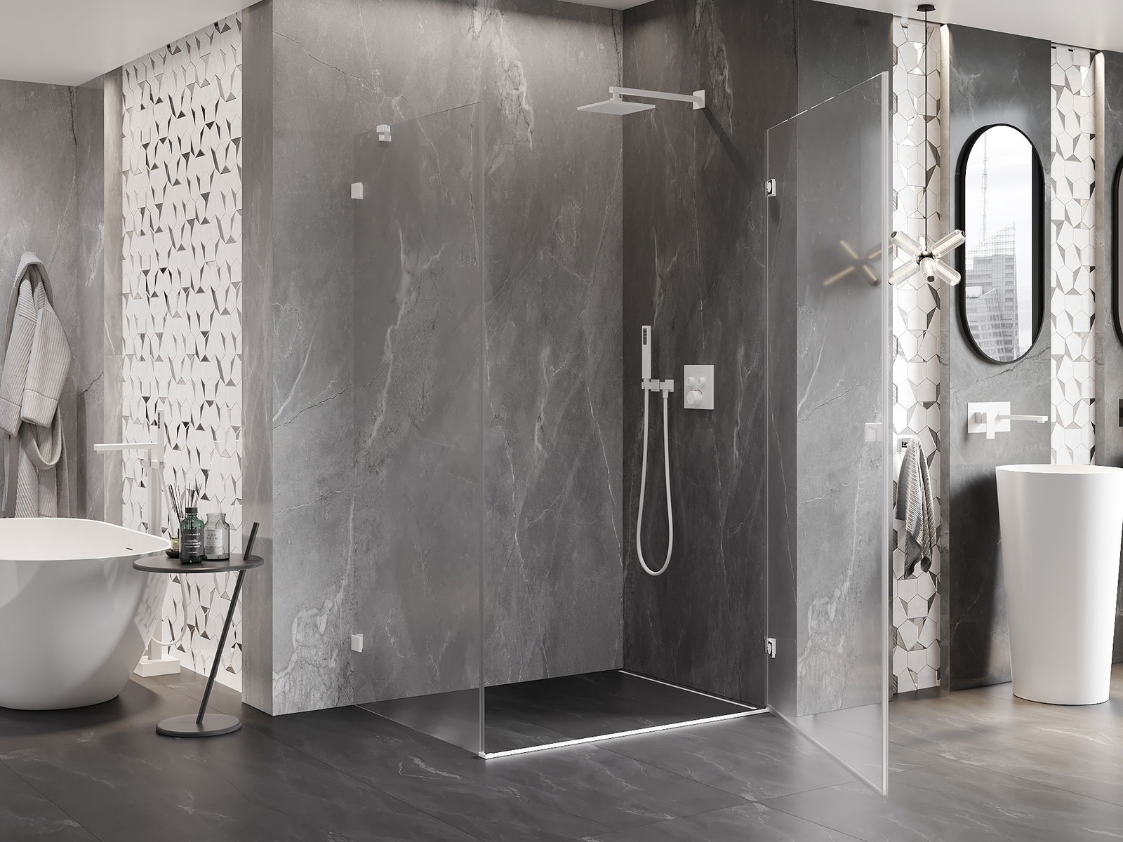 A pega prática e confortável foi feita de metal durável e resistente. A forma moderna combinada com o acabamento ajustado à cor dos perfis confere a todo o conjunto uma aparência moderna e estilosa, realçando a estética de qualquer casa de banho.