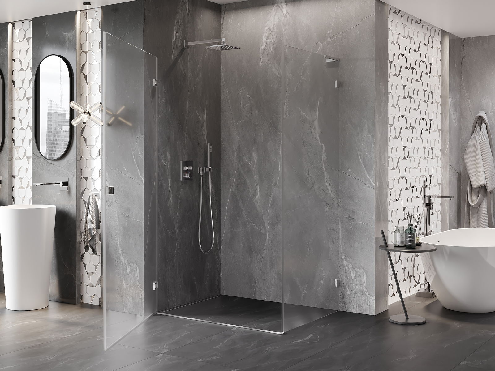 A pega prática e confortável foi feita de metal durável e resistente. A forma moderna combinada com o acabamento ajustado à cor dos perfis confere a todo o conjunto uma aparência moderna e estilosa, realçando a estética de qualquer casa de banho.