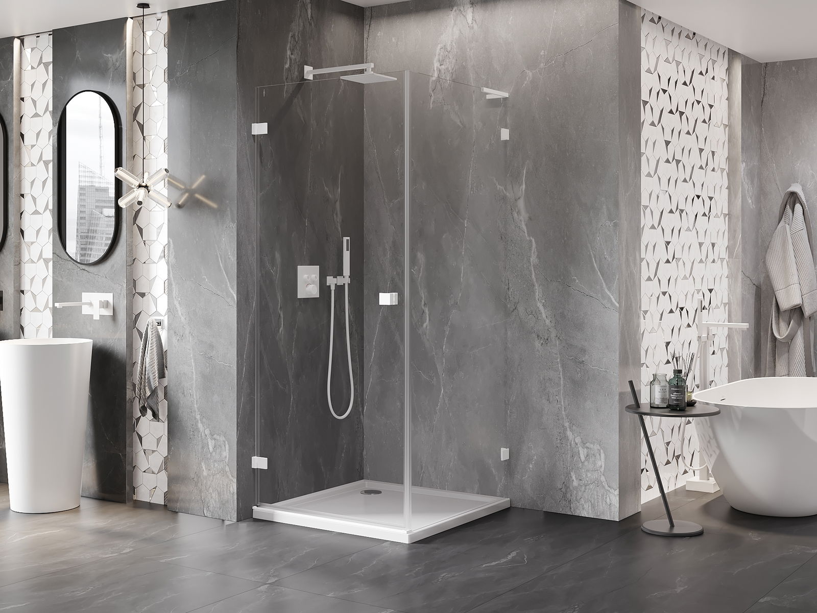 A pega prática e confortável foi feita de metal durável e resistente. A forma moderna combinada com o acabamento ajustado à cor dos perfis confere a todo o conjunto uma aparência moderna e estilosa, realçando a estética de qualquer casa de banho.