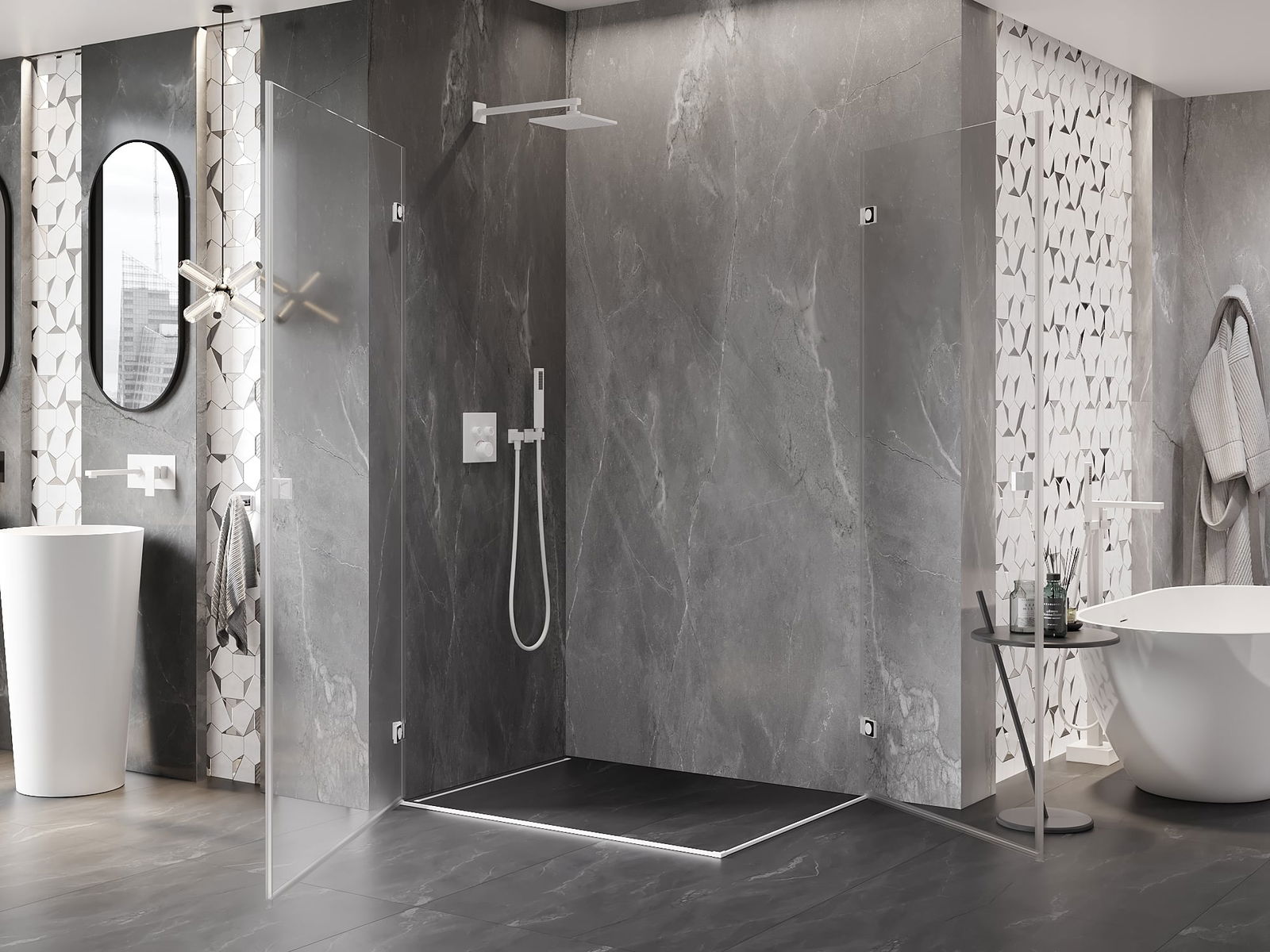 A pega prática e confortável foi feita de metal durável e resistente. A forma moderna combinada com o acabamento ajustado à cor dos perfis confere a todo o conjunto uma aparência moderna e estilosa, realçando a estética de qualquer casa de banho.