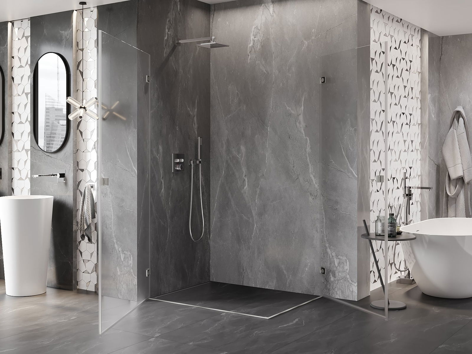 A pega prática e confortável foi feita de metal durável e resistente. A forma moderna combinada com o acabamento ajustado à cor dos perfis confere a todo o conjunto uma aparência moderna e estilosa, realçando a estética de qualquer casa de banho.