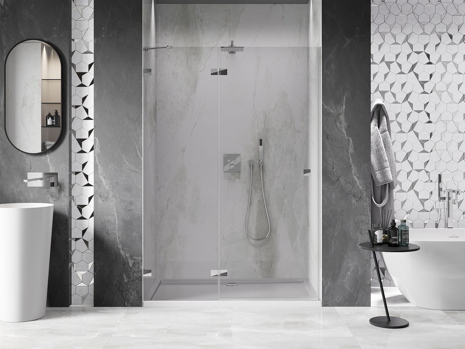 A pega prática e confortável foi feita de metal durável e resistente. A forma moderna combinada com o acabamento ajustado à cor dos perfis confere a todo o conjunto uma aparência moderna e estilosa, realçando a estética de qualquer casa de banho.