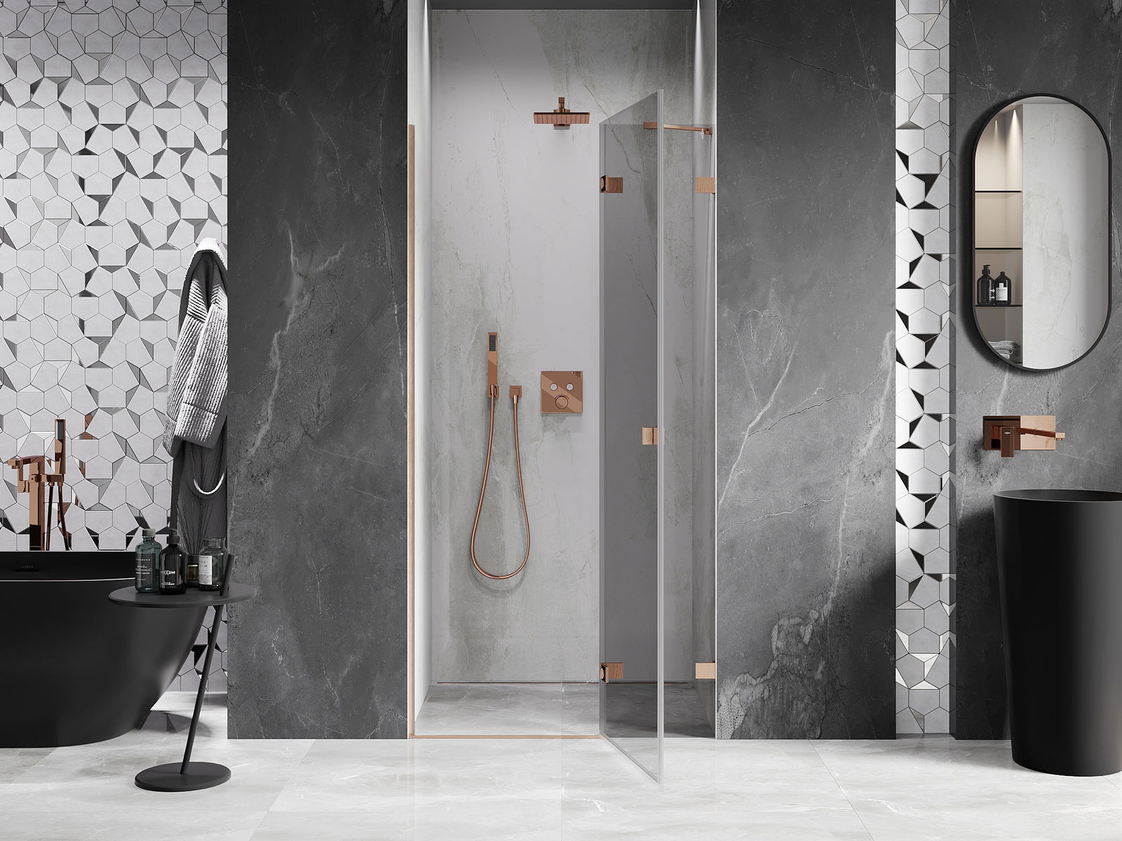 A pega prática e confortável foi feita de metal durável e resistente. A forma moderna combinada com o acabamento ajustado à cor dos perfis confere a todo o conjunto uma aparência moderna e estilosa, realçando a estética de qualquer casa de banho.