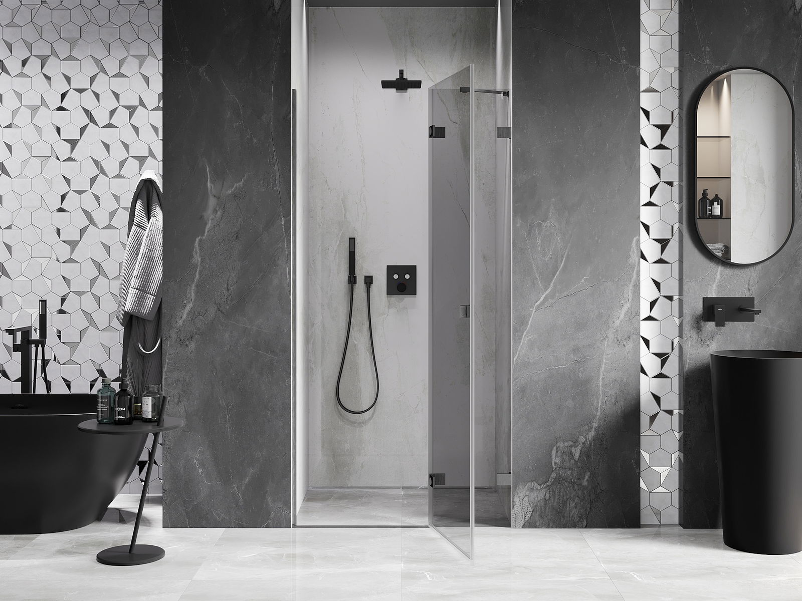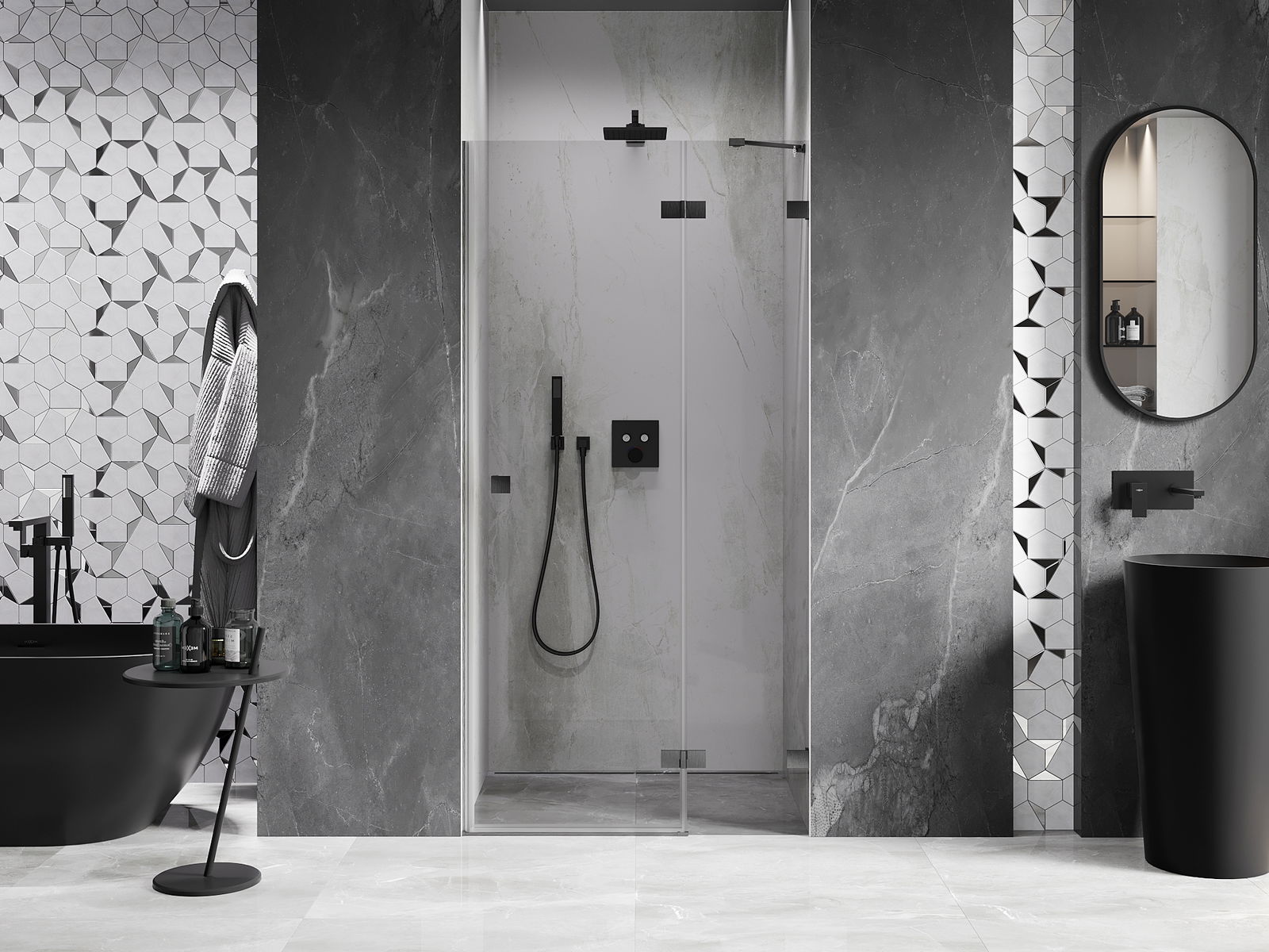 A pega prática e confortável foi feita de metal durável e resistente. A forma moderna combinada com o acabamento ajustado à cor dos perfis confere a todo o conjunto uma aparência moderna e estilosa, realçando a estética de qualquer casa de banho.