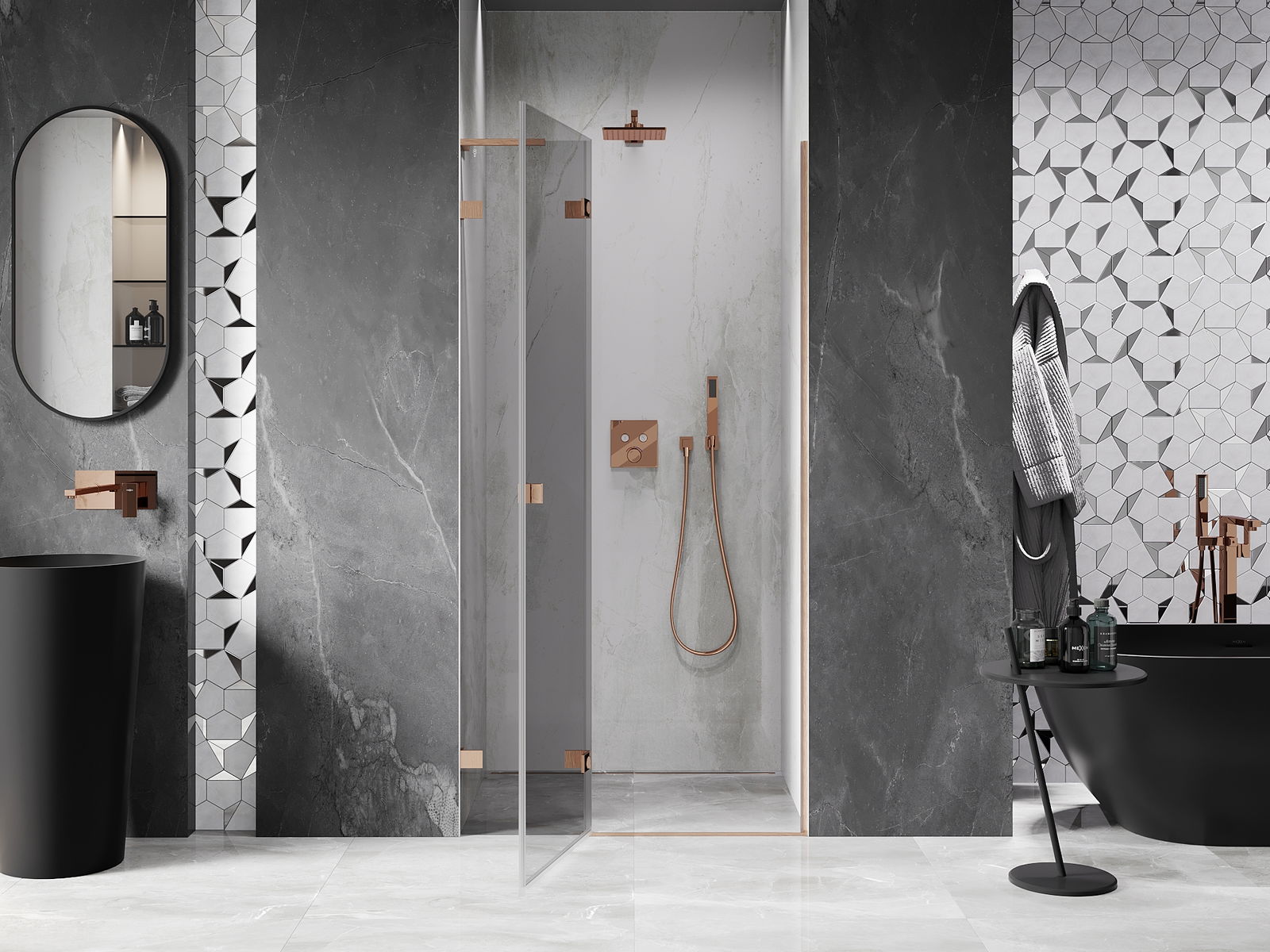 A pega prática e confortável foi feita de metal durável e resistente. A forma moderna combinada com o acabamento ajustado à cor dos perfis confere a todo o conjunto uma aparência moderna e estilosa, realçando a estética de qualquer casa de banho.