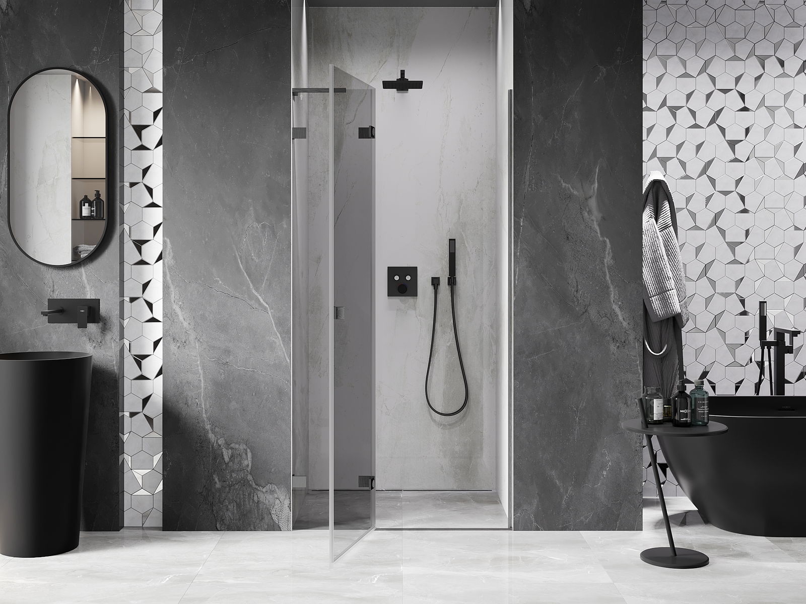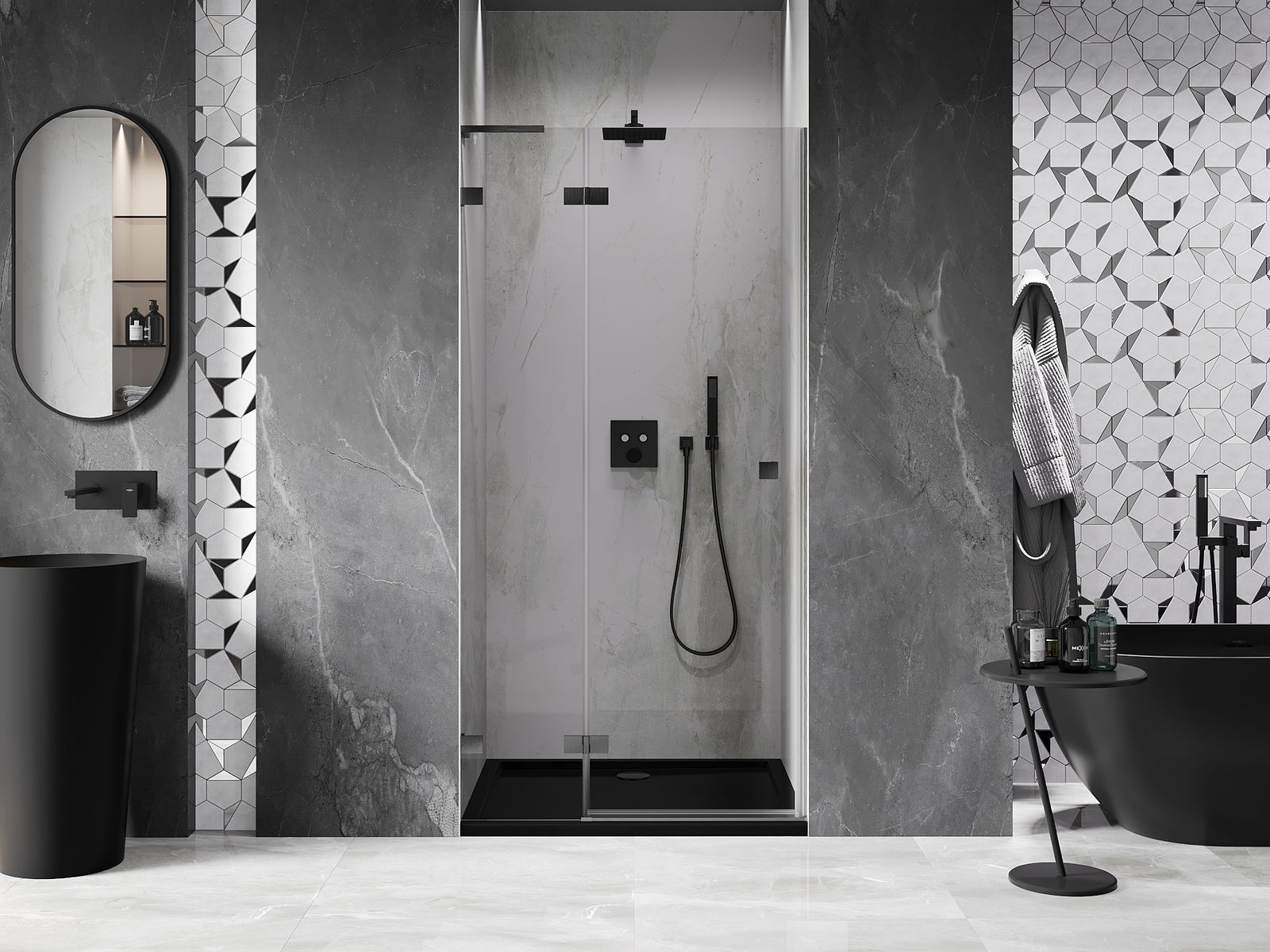 A pega prática e confortável foi feita de metal durável e resistente. A forma moderna combinada com o acabamento ajustado à cor dos perfis confere a todo o conjunto uma aparência moderna e estilosa, realçando a estética de qualquer casa de banho.