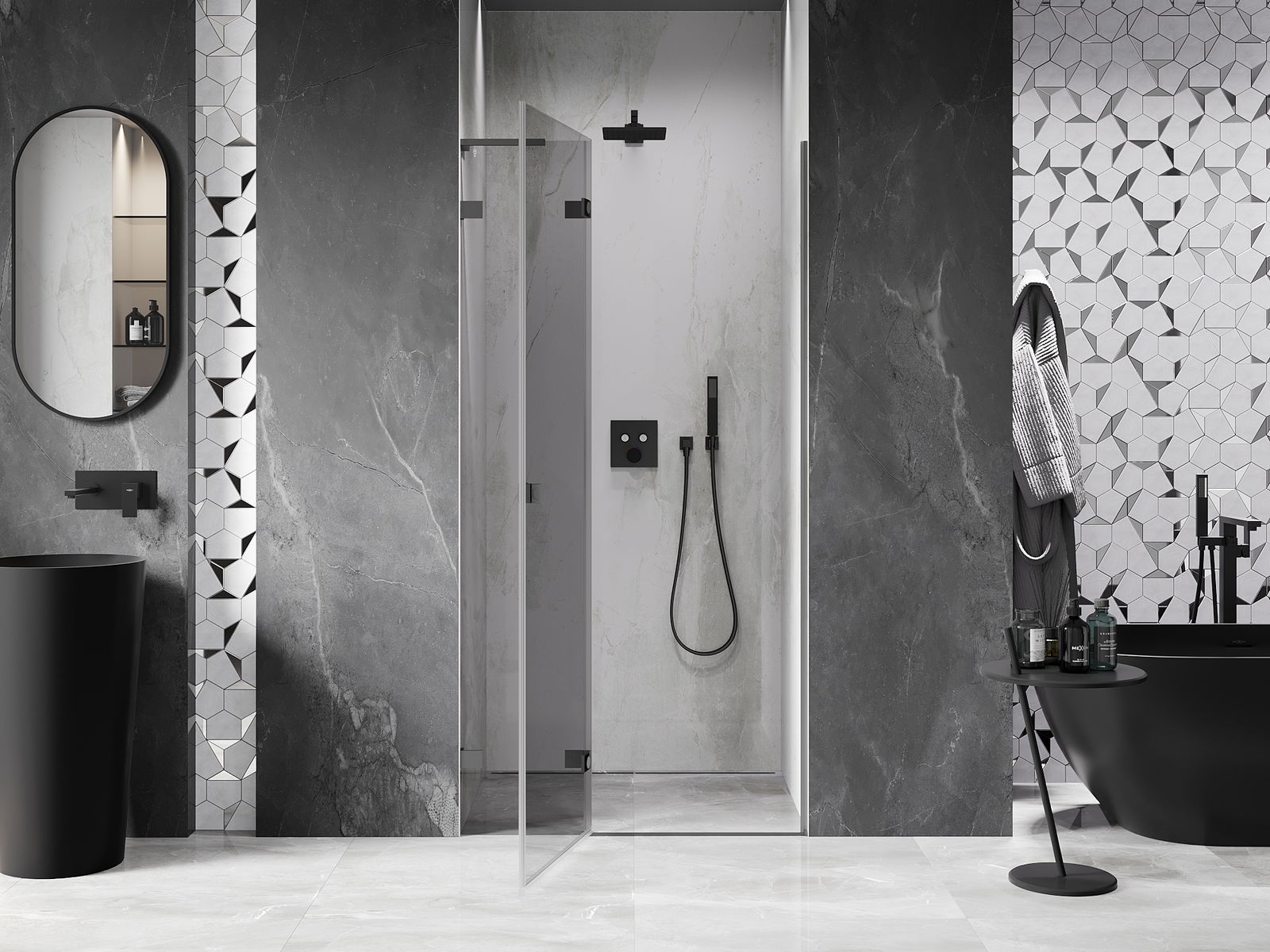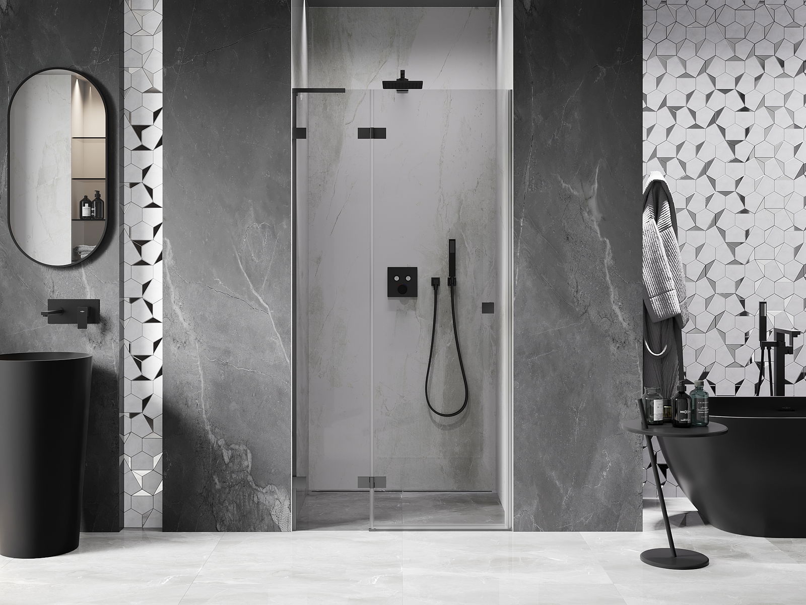 A pega prática e confortável foi feita de metal durável e resistente. A forma moderna combinada com o acabamento ajustado à cor dos perfis confere a todo o conjunto uma aparência moderna e estilosa, realçando a estética de qualquer casa de banho.