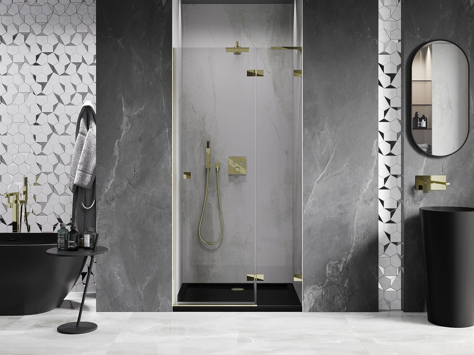A pega prática e confortável foi feita de metal durável e resistente. A forma moderna combinada com o acabamento ajustado à cor dos perfis confere a todo o conjunto uma aparência moderna e estilosa, realçando a estética de qualquer casa de banho.