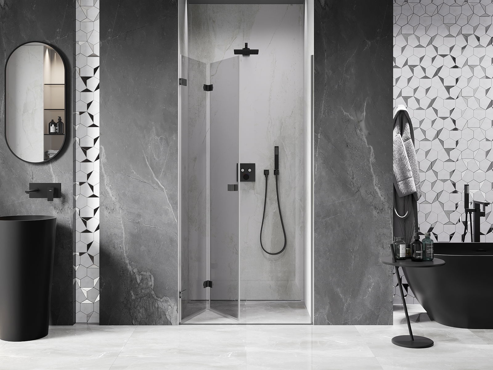 A pega prática e confortável foi feita de metal durável e resistente. A forma moderna combinada com o acabamento ajustado à cor dos perfis confere a todo o conjunto uma aparência moderna e estilosa, realçando a estética de qualquer casa de banho.