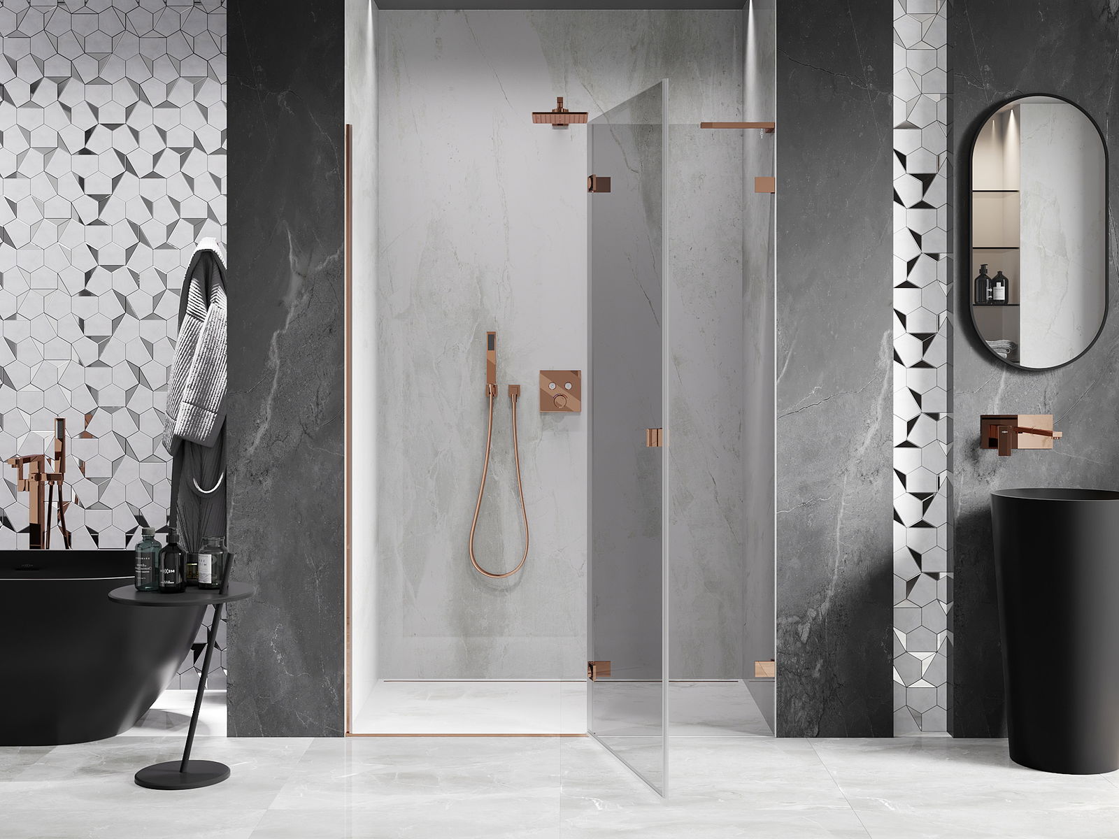 A pega prática e confortável foi feita de metal durável e resistente. A forma moderna combinada com o acabamento ajustado à cor dos perfis confere a todo o conjunto uma aparência moderna e estilosa, realçando a estética de qualquer casa de banho.
