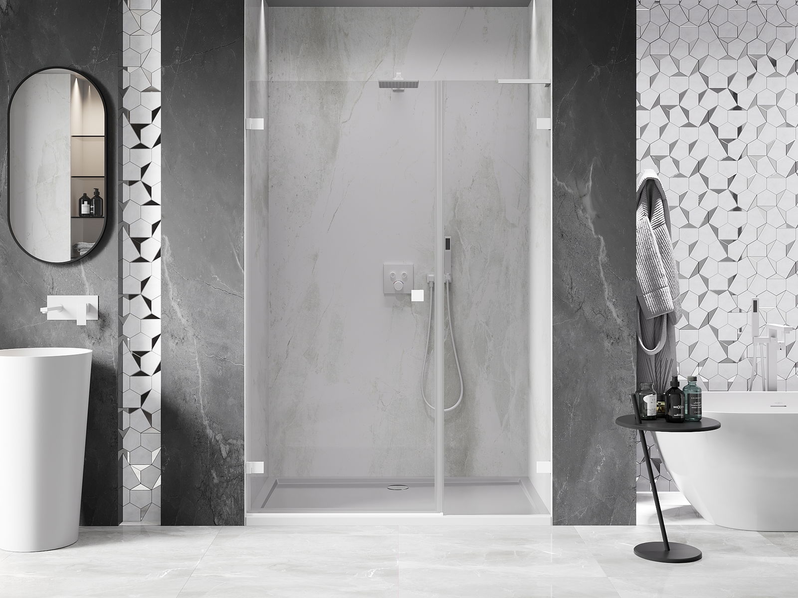 A pega prática e confortável foi feita de metal durável e resistente. A forma moderna combinada com o acabamento ajustado à cor dos perfis confere a todo o conjunto uma aparência moderna e estilosa, realçando a estética de qualquer casa de banho.