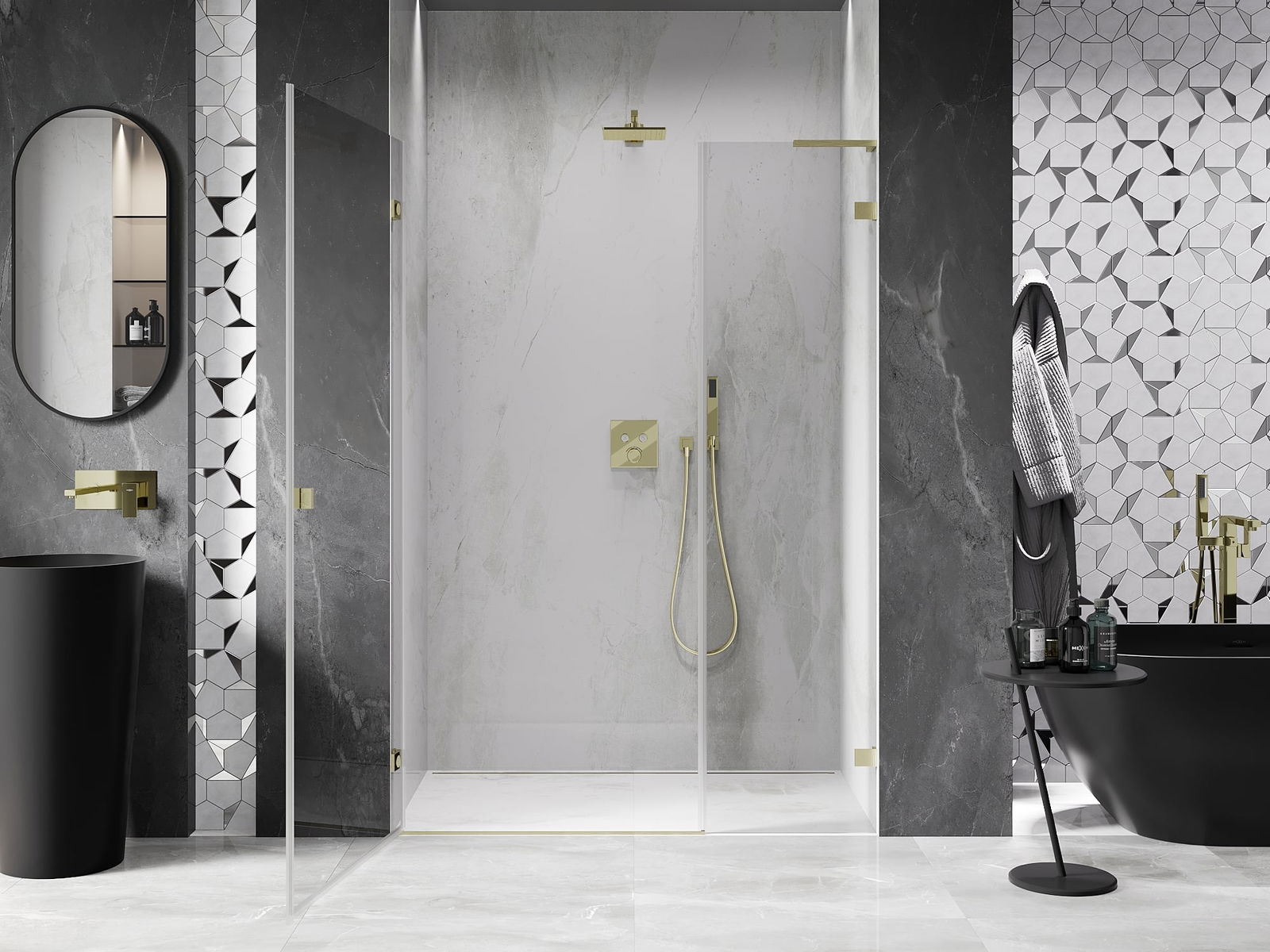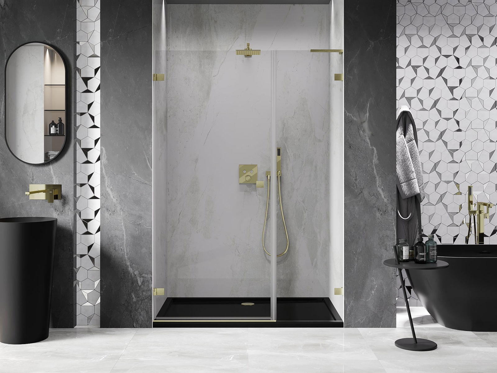 A pega prática e confortável foi feita de metal durável e resistente. A forma moderna combinada com o acabamento ajustado à cor dos perfis confere a todo o conjunto uma aparência moderna e estilosa, realçando a estética de qualquer casa de banho.