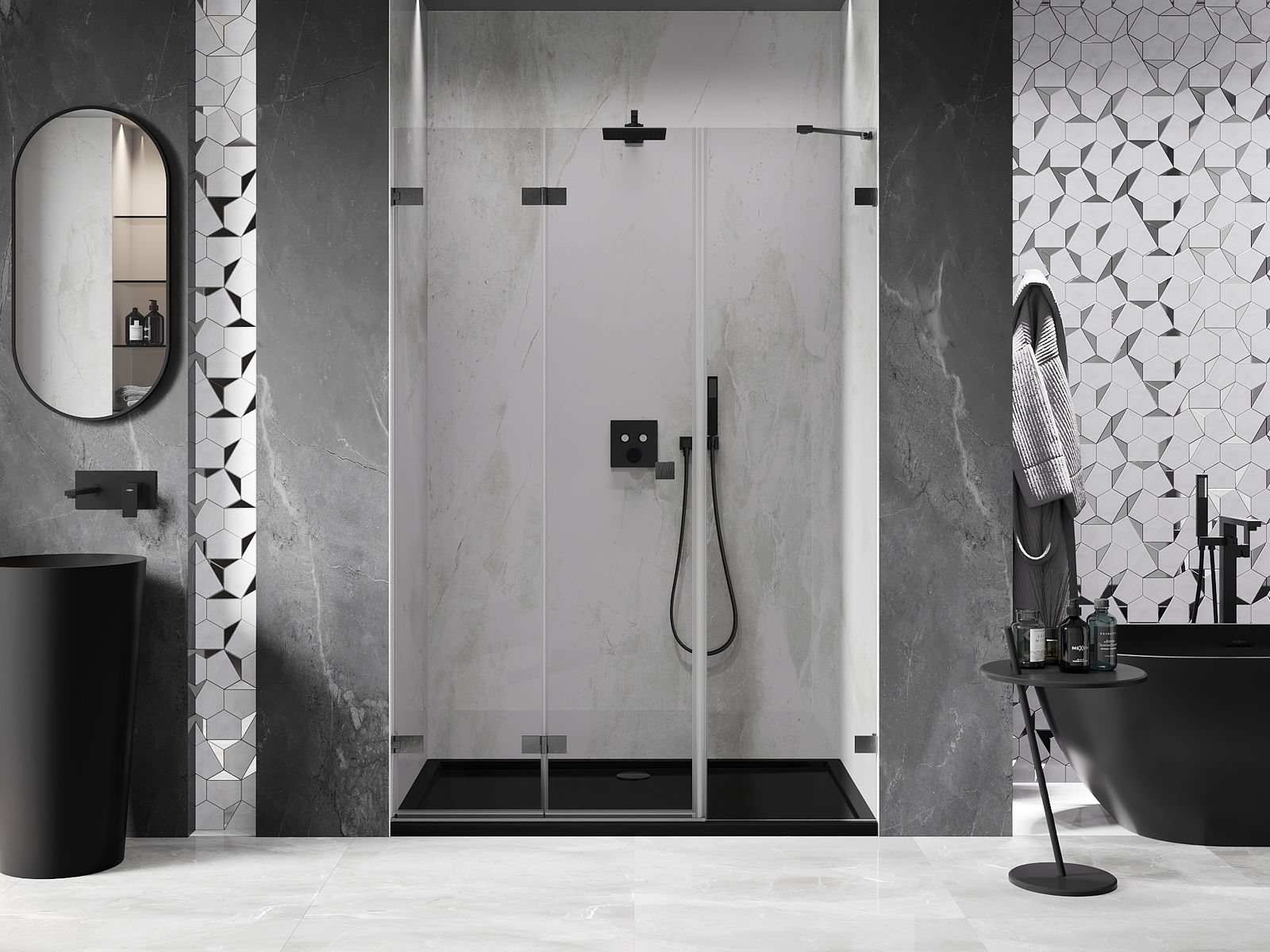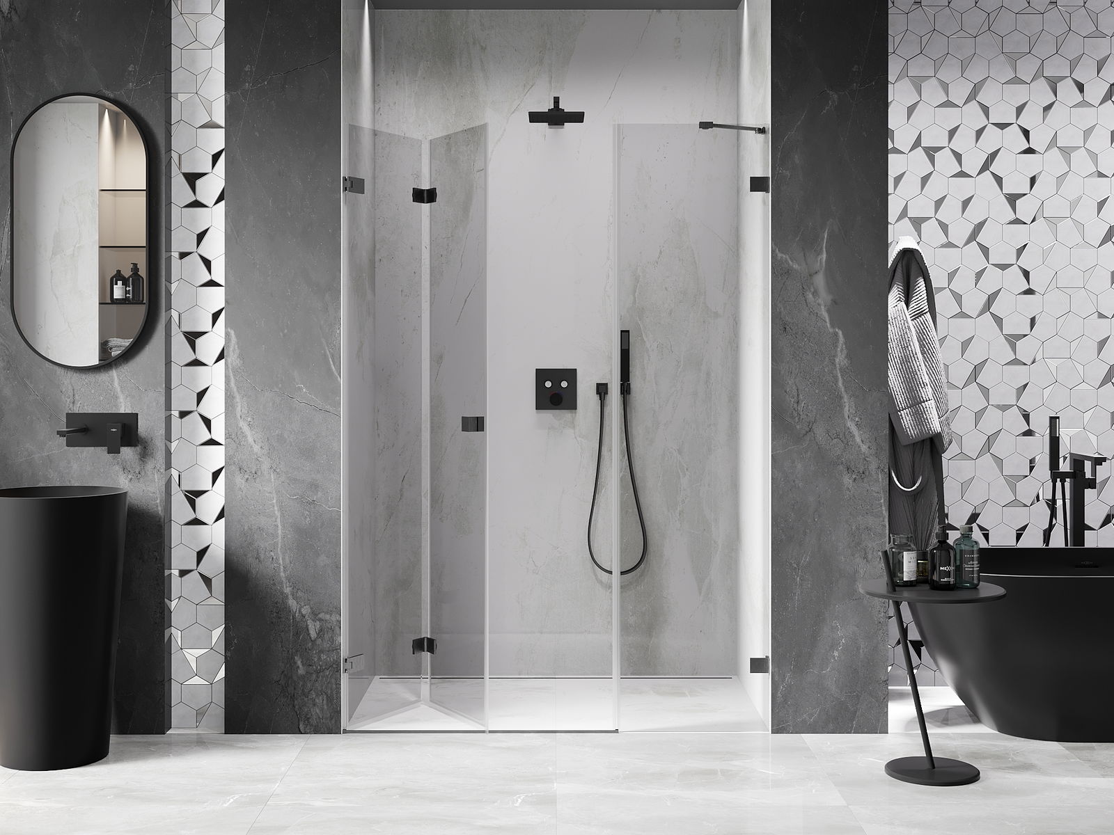 A pega prática e confortável foi feita de metal durável e resistente. A forma moderna combinada com o acabamento ajustado à cor dos perfis confere a todo o conjunto uma aparência moderna e estilosa, realçando a estética de qualquer casa de banho.