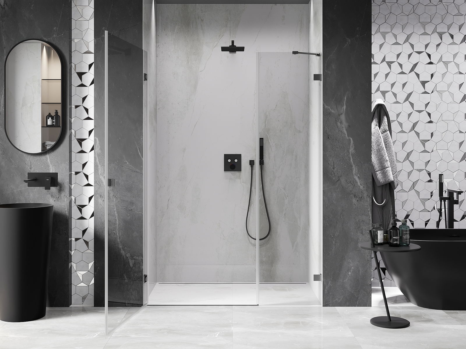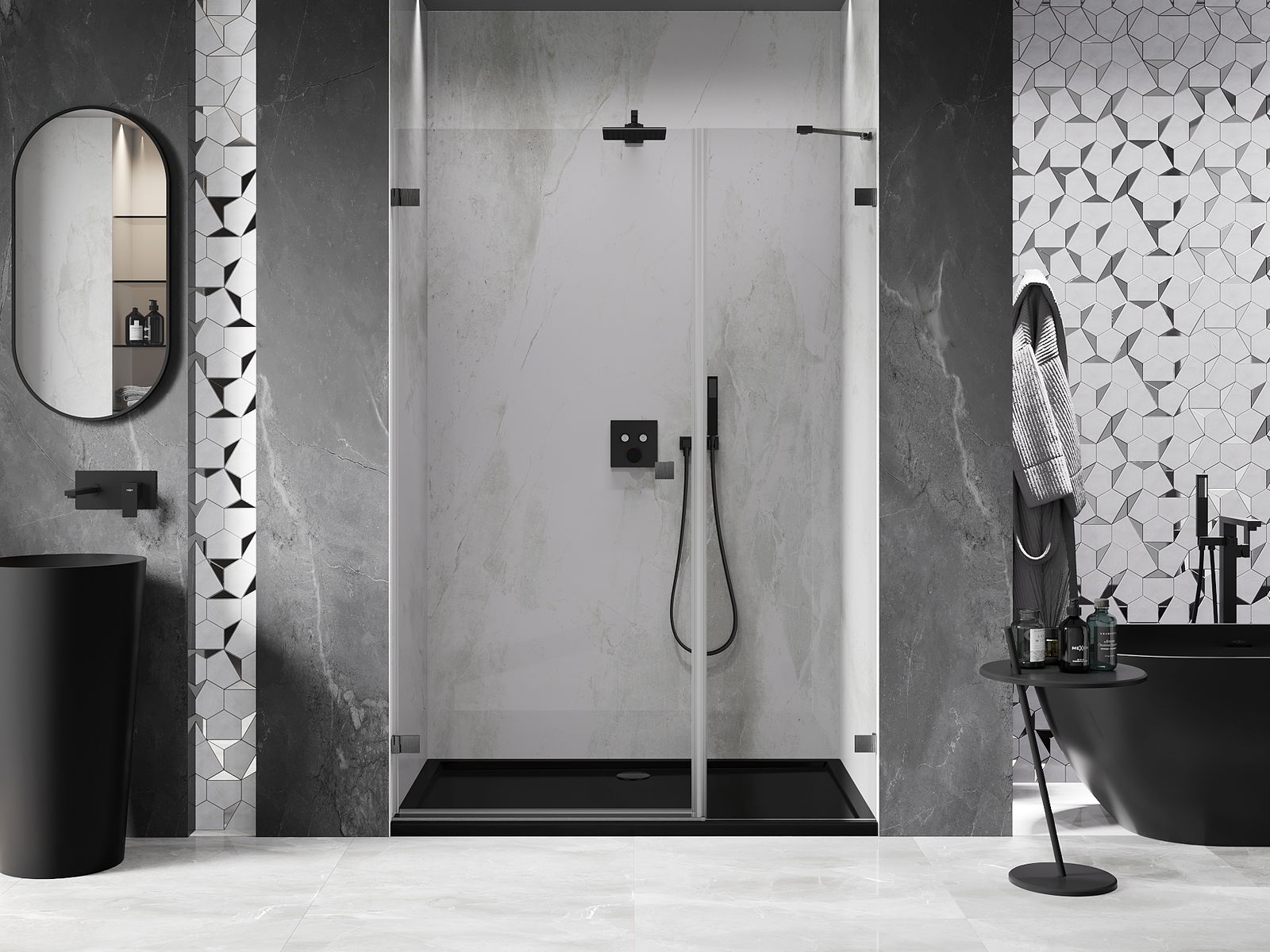 A pega prática e confortável foi feita de metal durável e resistente. A forma moderna combinada com o acabamento ajustado à cor dos perfis confere a todo o conjunto uma aparência moderna e estilosa, realçando a estética de qualquer casa de banho.