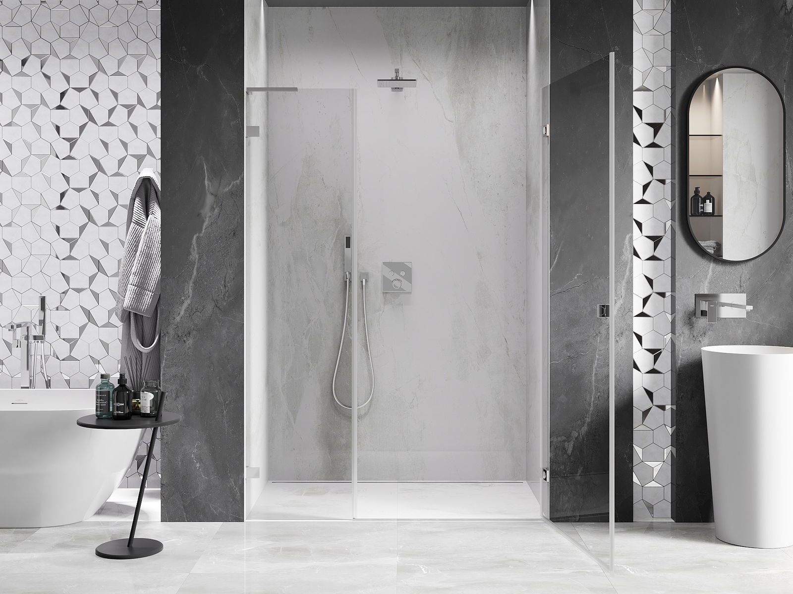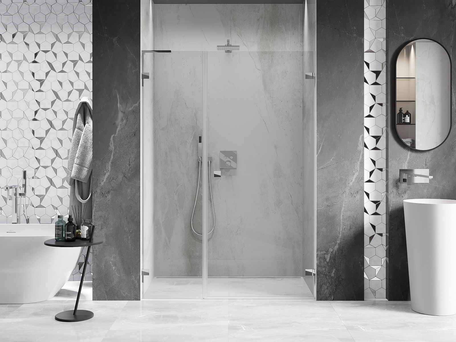 A pega prática e confortável foi feita de metal durável e resistente. A forma moderna combinada com o acabamento ajustado à cor dos perfis confere a todo o conjunto uma aparência moderna e estilosa, realçando a estética de qualquer casa de banho.