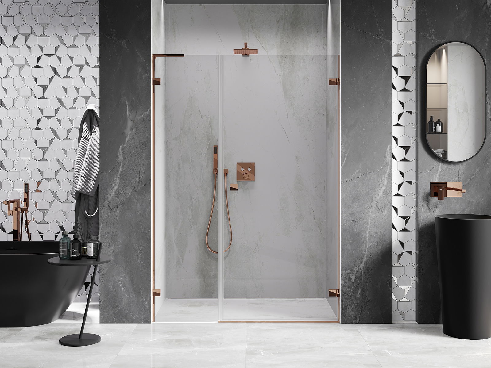 A pega prática e confortável foi feita de metal durável e resistente. A forma moderna combinada com o acabamento ajustado à cor dos perfis confere a todo o conjunto uma aparência moderna e estilosa, realçando a estética de qualquer casa de banho.