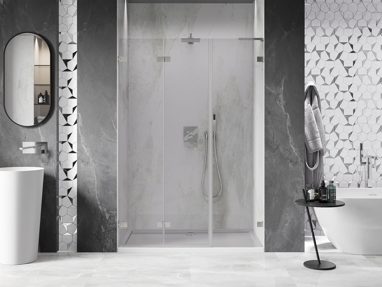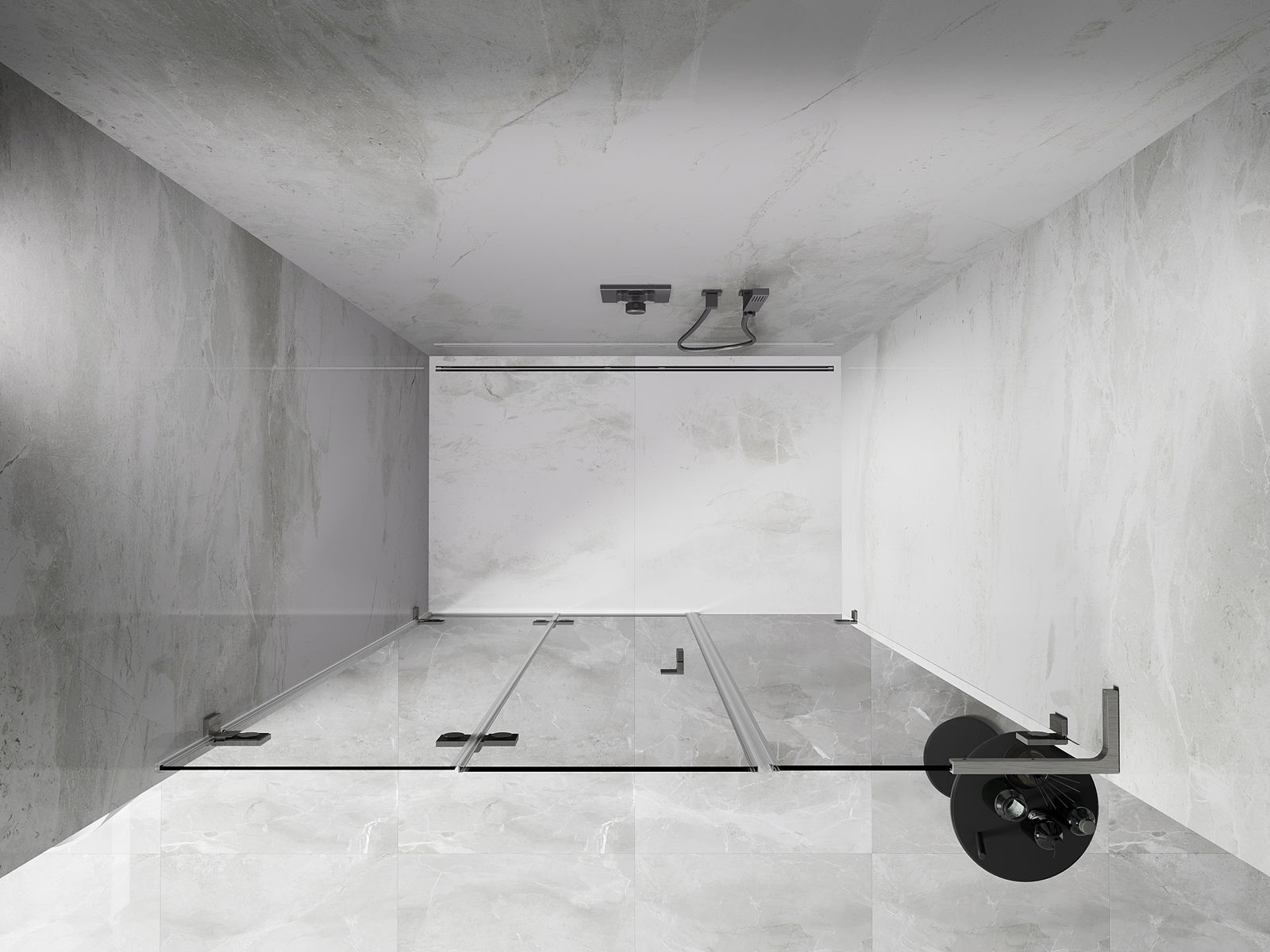 A pega prática e confortável foi feita de metal durável e resistente. A forma moderna combinada com o acabamento ajustado à cor dos perfis confere a todo o conjunto uma aparência moderna e estilosa, realçando a estética de qualquer casa de banho.